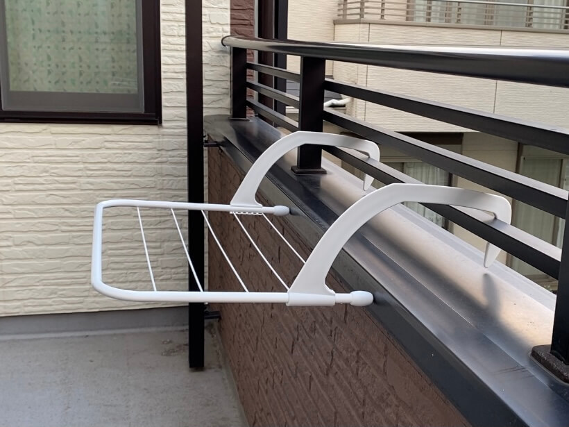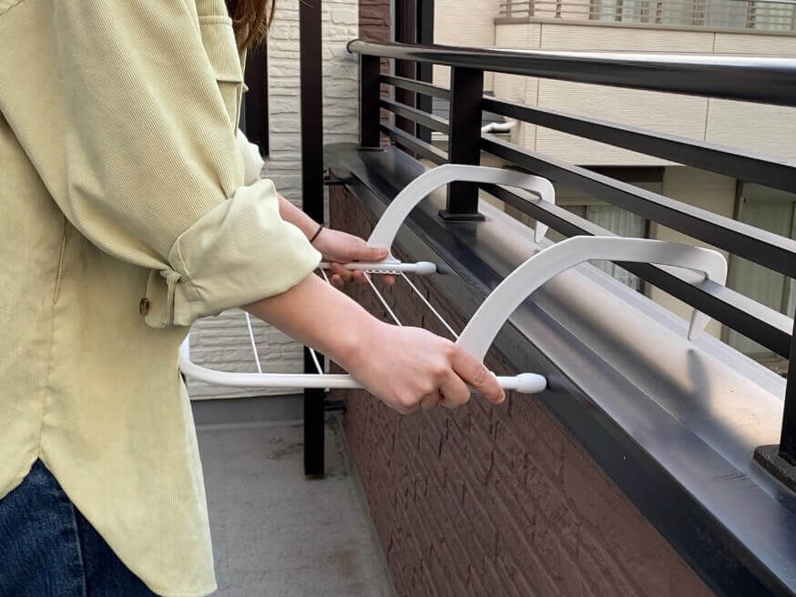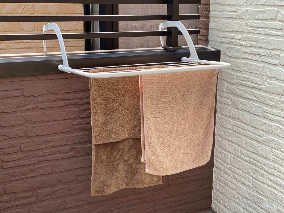 スニーカー同様、ベランダの手すりに引っ掛けラックを下げ、タオルを干すだけで完了!ピンチもないので、乾いた洗濯物を取り込む手間も省けます。
