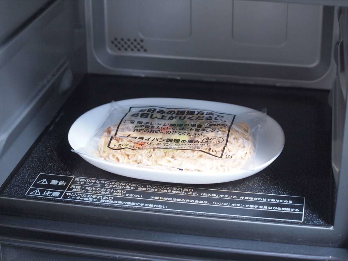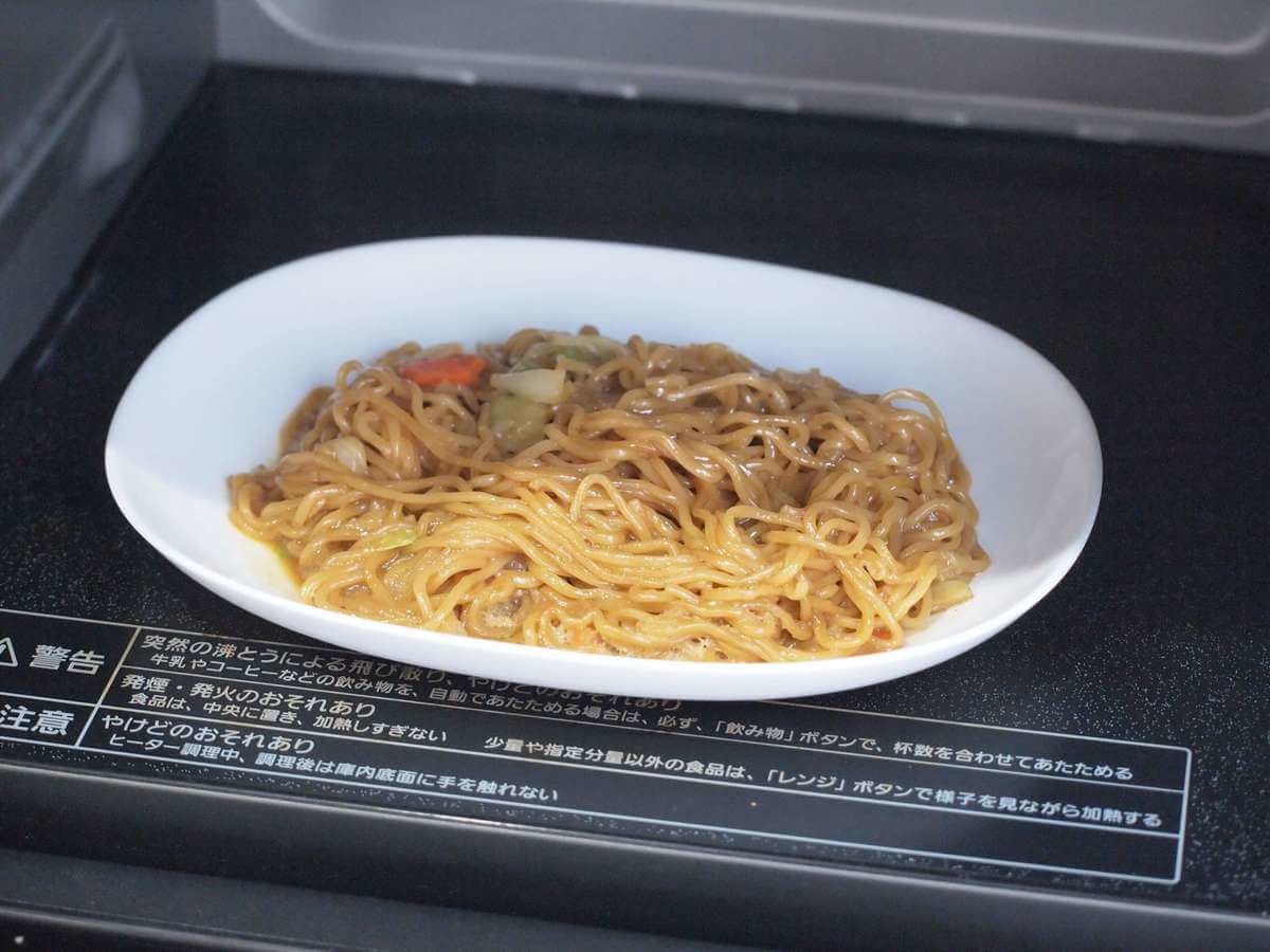 まずは、日清焼きそばを表記の通りレンジ加熱します。(600Wなら3分30秒、500Wなら4分10秒)