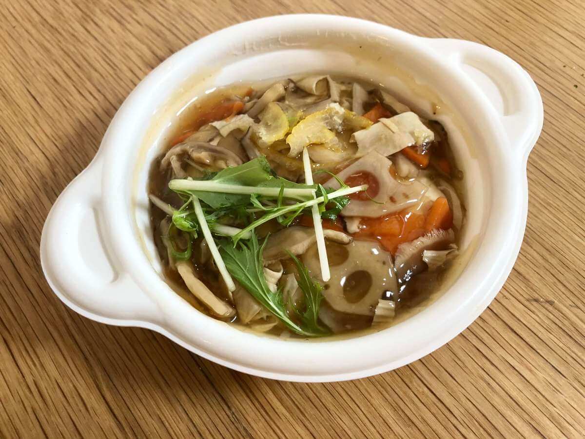 しいたけや、ゆばの柔らかい触感のなか、水菜のシャキシャキ感やれんこんの歯ごたえが最高です。