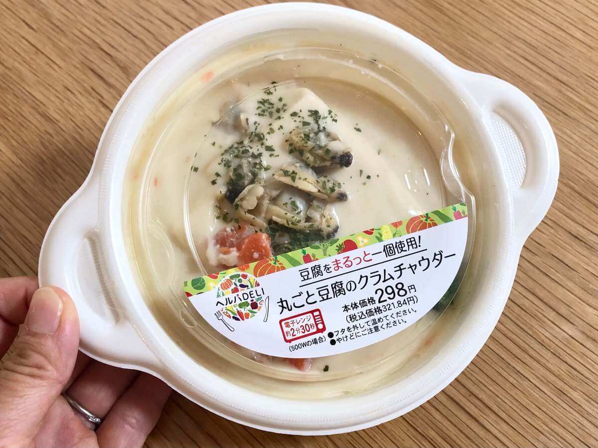 同じく【ヘルパDELI】シリーズの『まるごと豆腐のクラムチャウダー』です。実ははじめはホワイトソースに豆腐という斬新な組み合わせに、少し面くらいました。