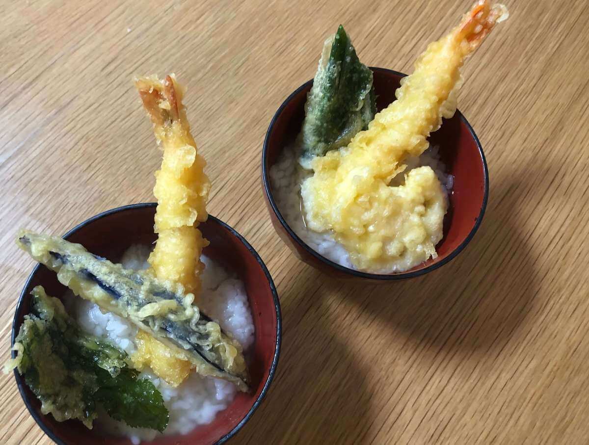 1色目はおそばに合わせて各自、好きなものをチョイス。2食目は残った天ぷらを適当に乗せた天丼や天茶漬けにしています。