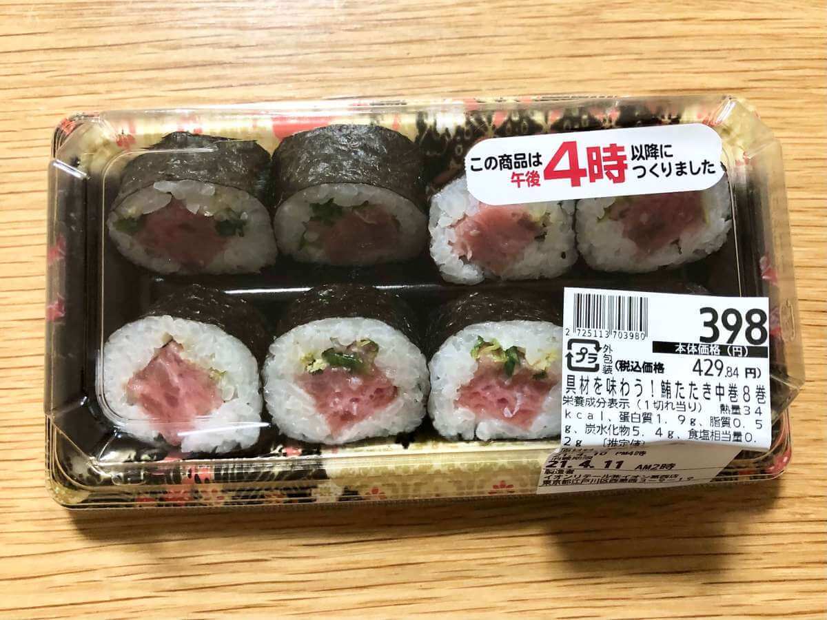 ほかにもイオンのお寿司系だと、いなり寿司や納豆巻きが我が家では人気です。そして忘れてはならないのが、火曜日の「細巻きバイキング」。ねぎまぐろやサーモンなどたくさんの細巻きが約100円で買える大人気イベントは、売り切れも早く要チェックですよ。