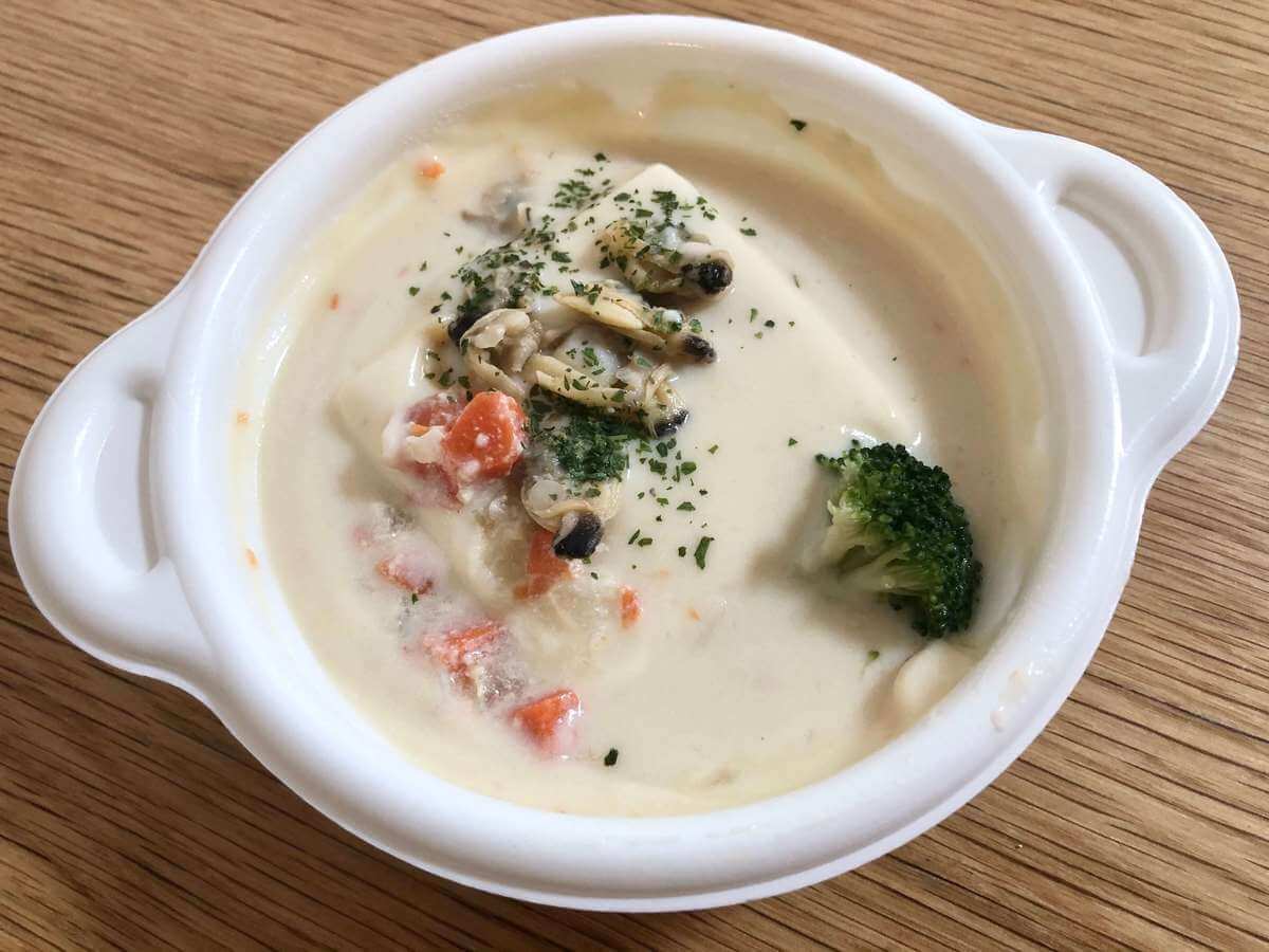 どうやら牛乳ではなく豆乳ベースだったので、豆腐とマッチするみたいです。しかも水抜きされた豆腐なので、豆腐の水っぽさがなくクラムチャウダーの濃厚さをしっかり味わえます。