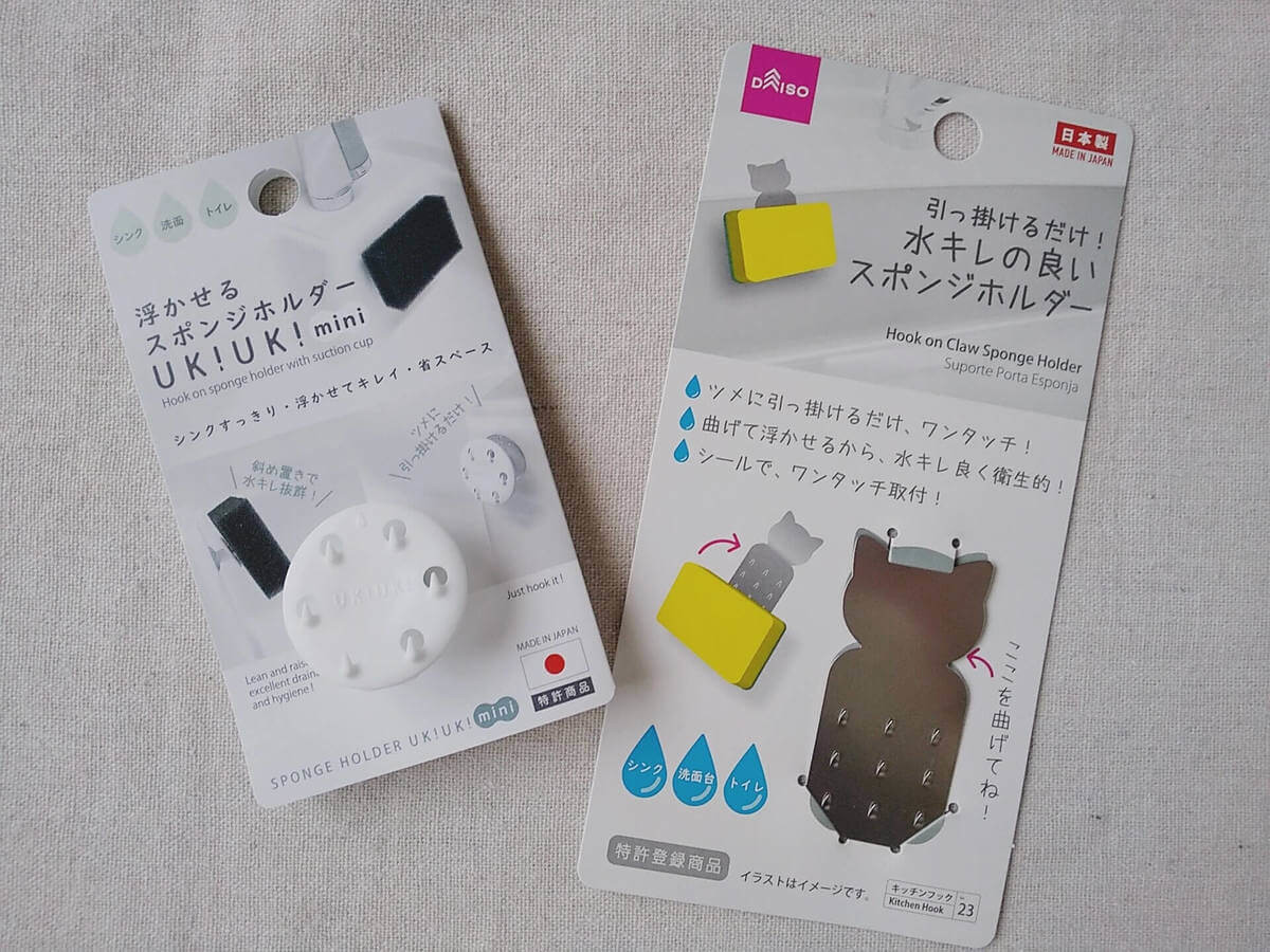 ダイソーには数種類のスポンジホルダーがありましたが、その中からスポンジを「浮かせる」タイプを2種類購入してみました。
