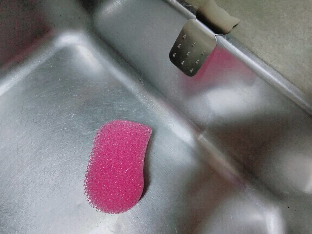 シンク周りで邪魔に感じるのが、キッチンスポンジの存在です。これまでラックに置いていましたが、狭いシンクで場所をとるしラックの掃除も面倒で……。