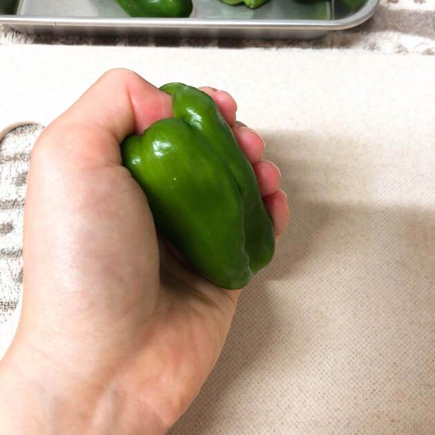 (1)親指でピーマンのヘタをぐっと押し、種を取り出す
