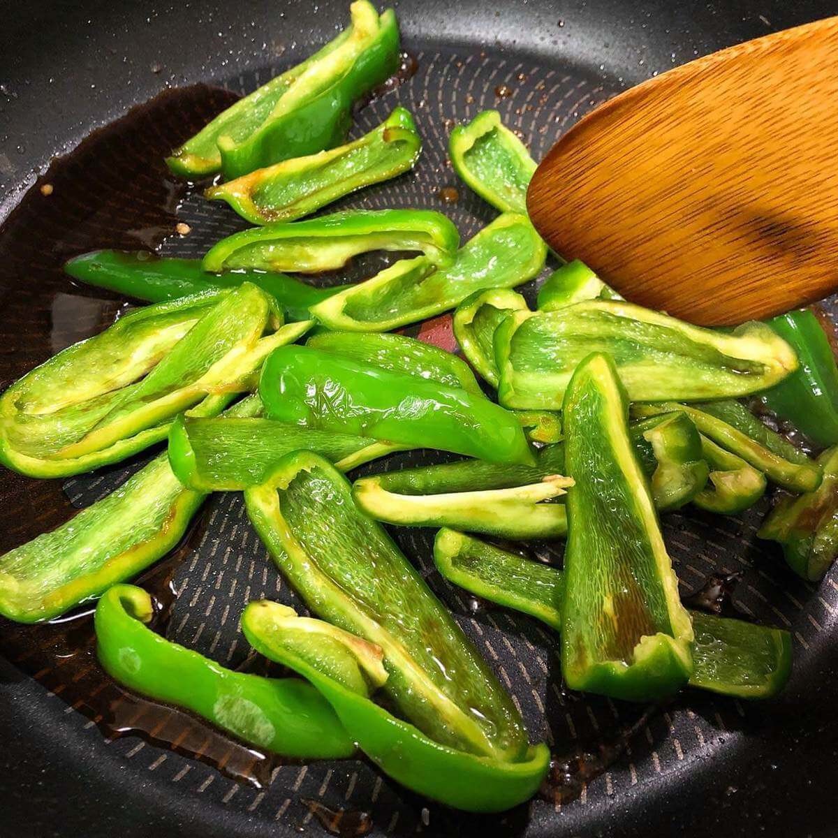 (4)めんつゆ、醤油を入れ、ピーマンがしんなりするまで炒める