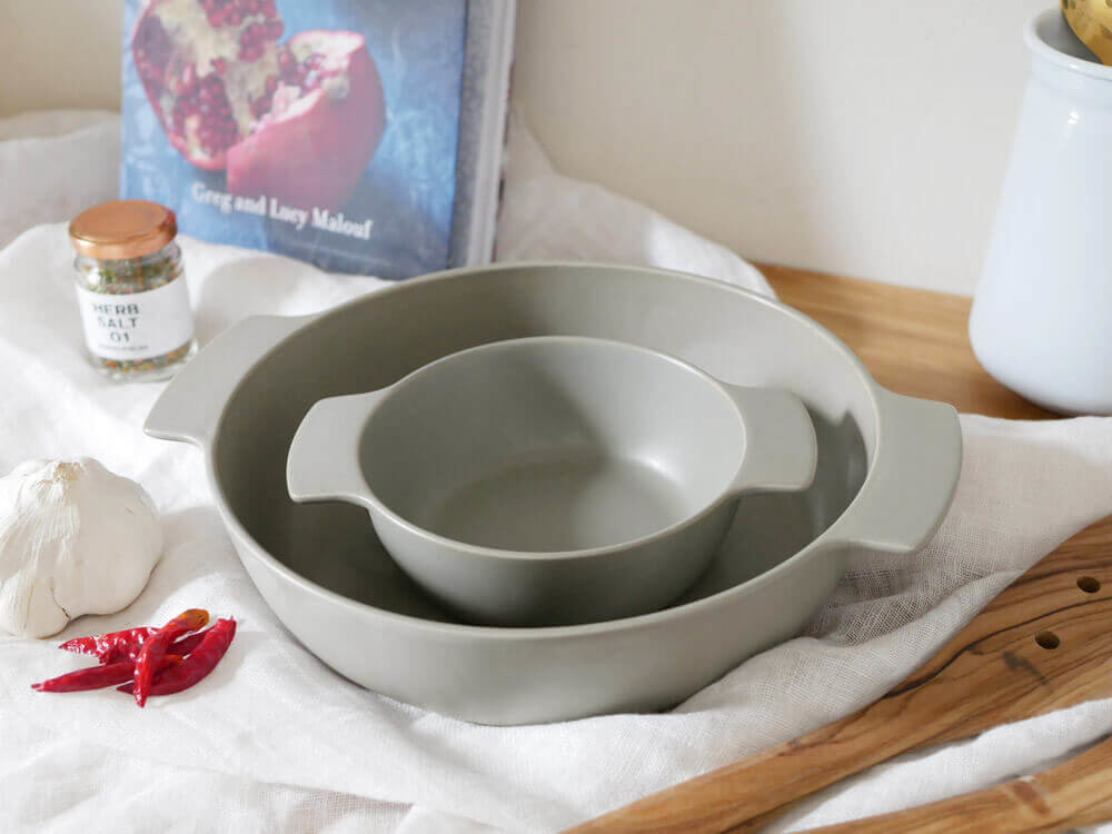 グレー、ブラックのお洒落なモノトーンカラーとシンプルなフォルムはお料理を一層引き立てます。色違いで揃えても食卓を雑多な印象にせず、モダンに馴染むのも◎。
