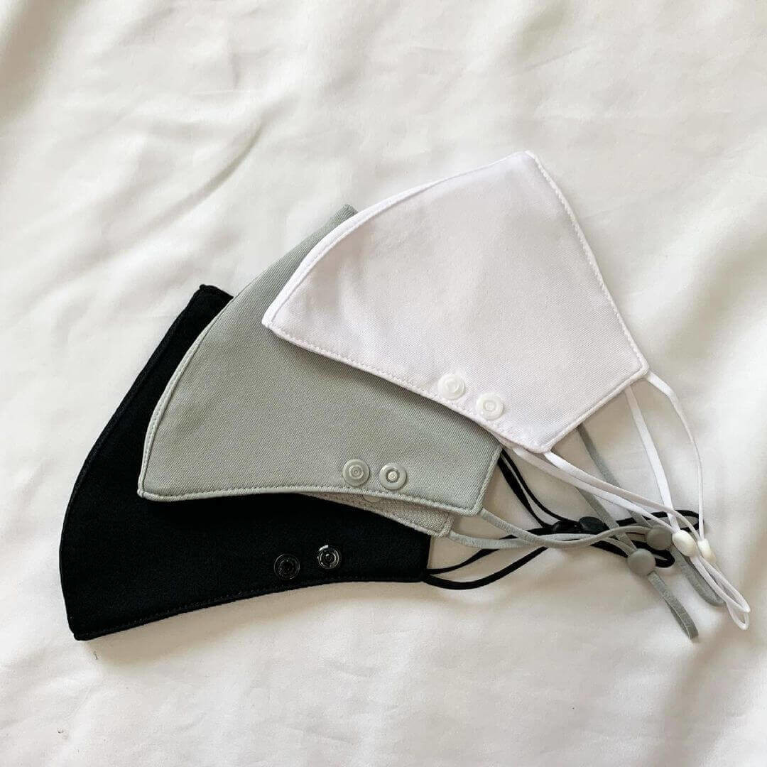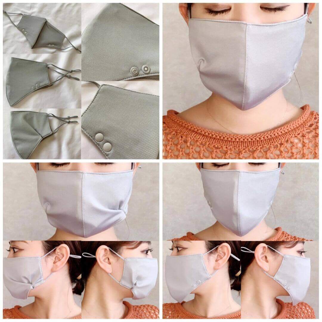 シーンやシチュエーションによって、ボタンを留めたり外して使い方をアレンジできる実用性のあるマスクです。
