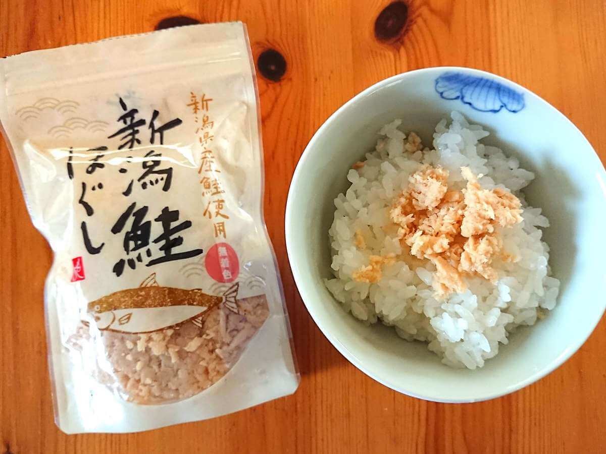 新潟県の鮭を使用した無着色、無香料で添加物を一切使っていない鮭ほぐしです。