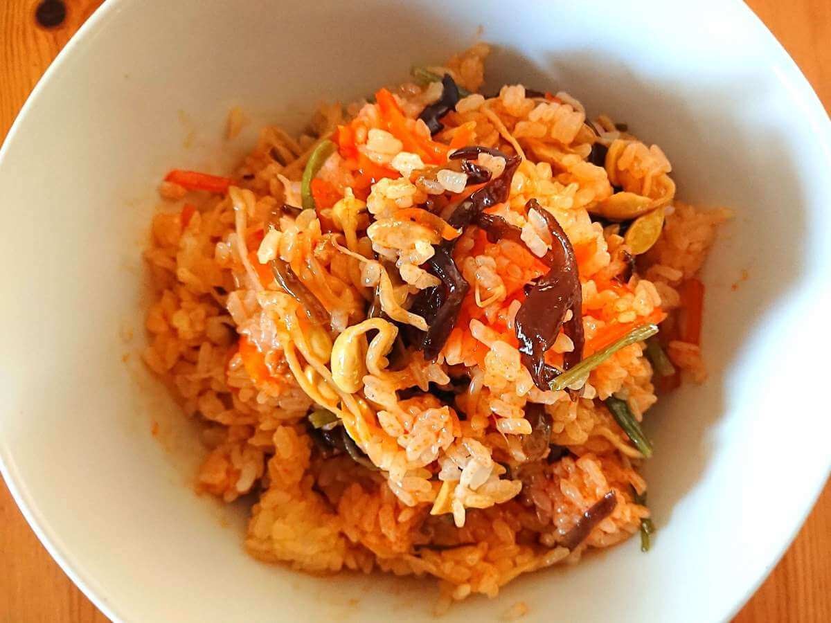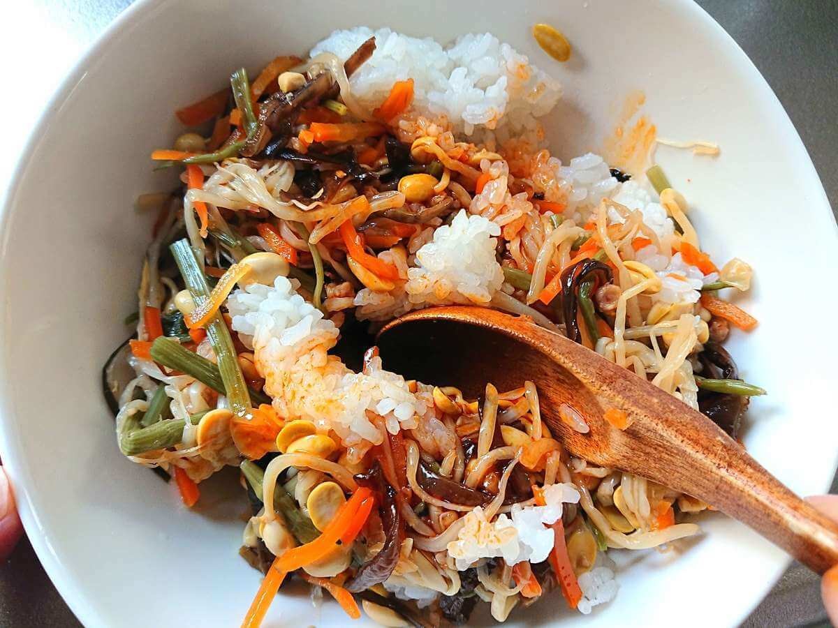 大豆もやし、人参、ぜんまいなど野菜がたっぷり入っていて、野菜の歯ごたえもきちんと残っています。