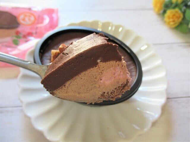 ひと口食べてみると、フランボワーズムースの酸味がチョコの甘ったるさを緩和してくれます。