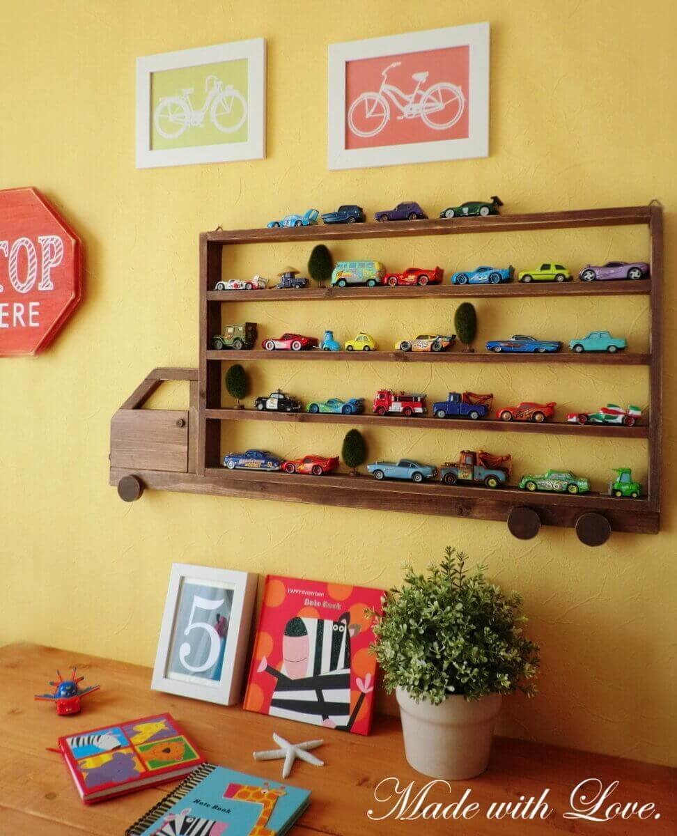 子どもが大好きなミニカーやフィギュアをディスプレイできる、トラック型のシェルフです。