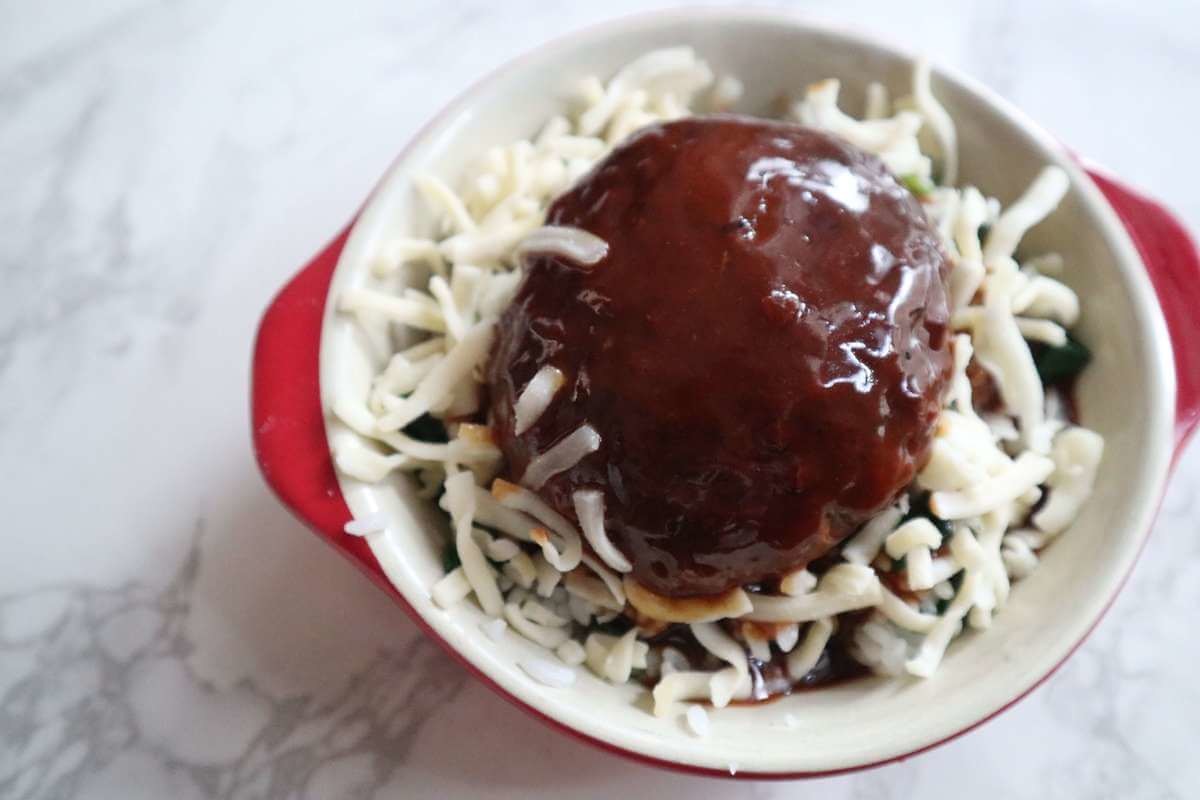 ごはんをグラタン皿にいれて、その上にハンバーグとデミグラスソースも全てのせます。