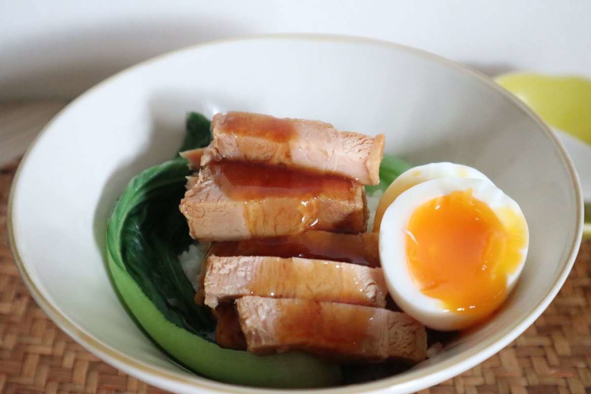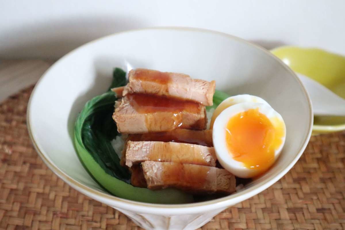 丼ぶりにご飯(1膳分)を盛り、茹でたチンゲン菜(お好みの量)、食べやすい大きさに切った角煮、半熟茹で卵をトッピングしたら、最後にソースをかけて完成。