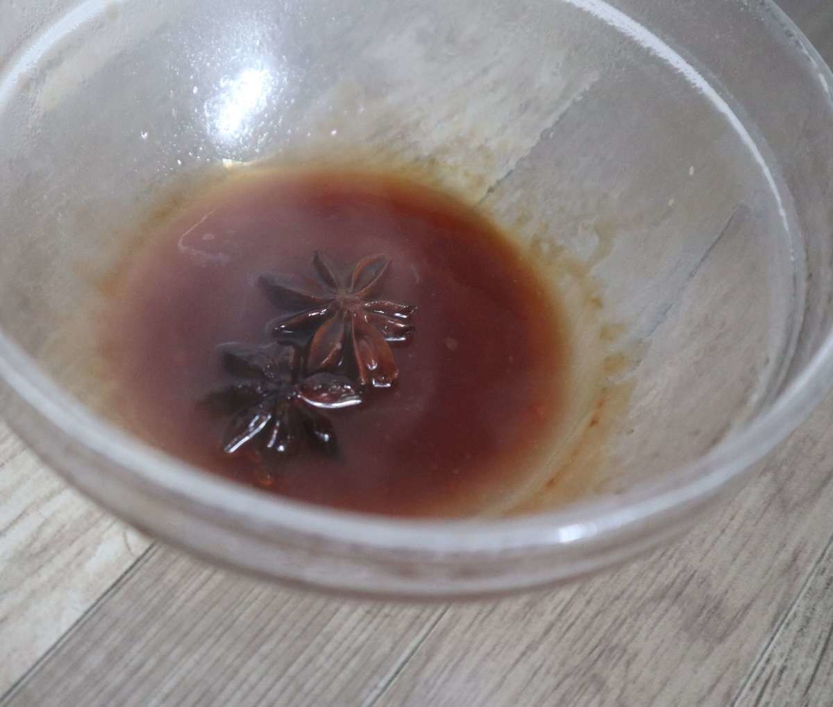 さらにスターアニスと煮汁だけ耐熱容器に移して1分加熱してとろみをつけます。