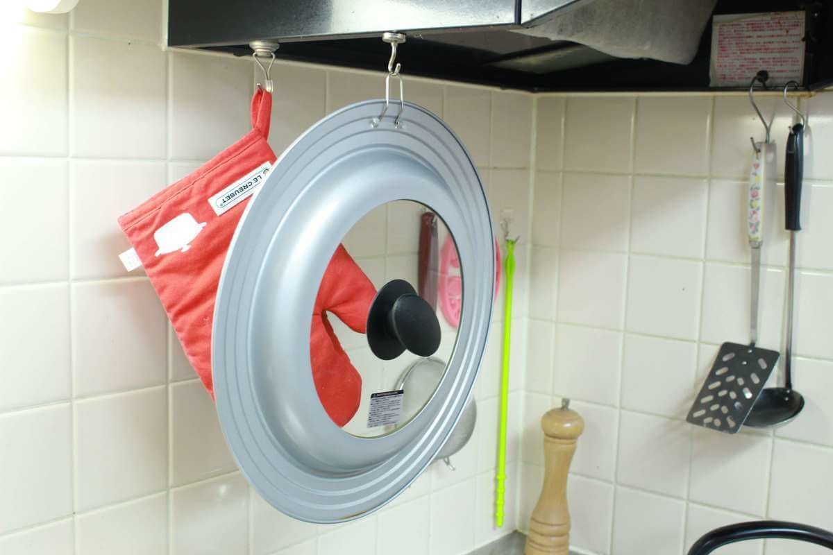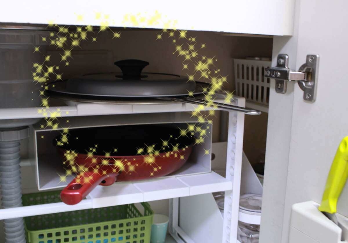 さらに、平べったい形状なので先ほどのフライパンカバーと重ねてちょっとした隙間に収納しています。