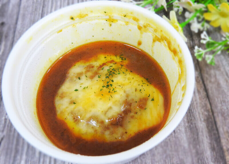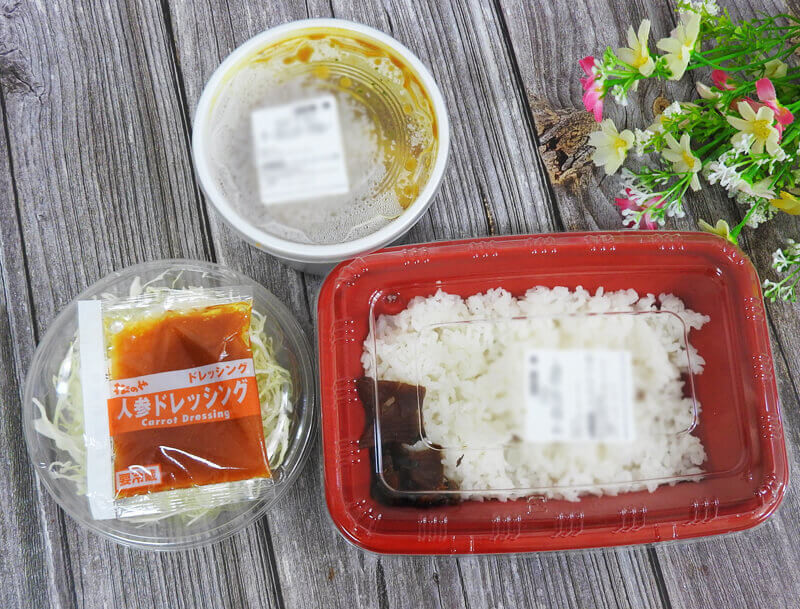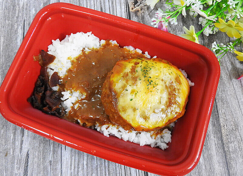 カレーとチーズハンバーグは、ごはんとは別の容器に入っていました。容器にカレーがついている上記の写真を見てお察しいただけるかもしれませんが、カレーが漏れやすいので持ち運ぶ時には、なるべく傾けないように気を付けましょう。