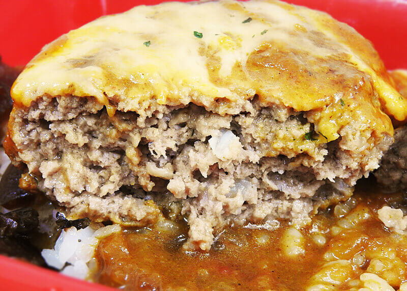 カレーとチーズハンバーグをごはんの上にかけてみました。カレーの量が少ないのがちょっと不満ですね。