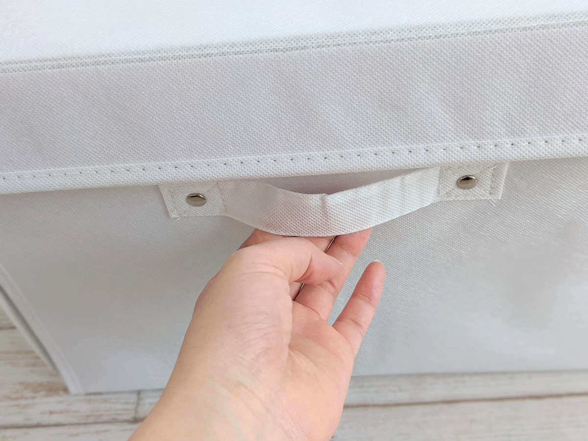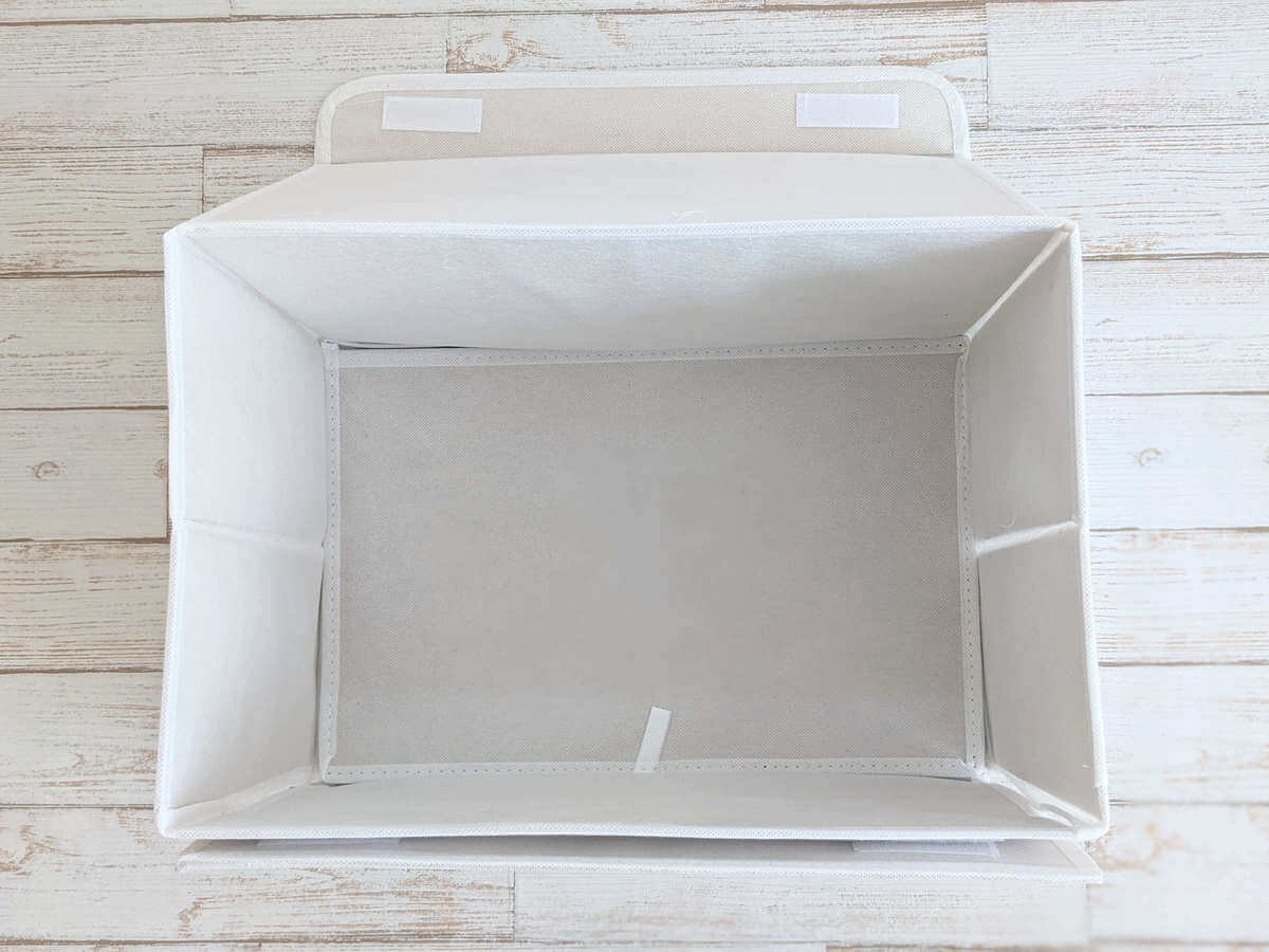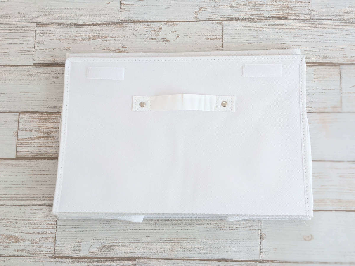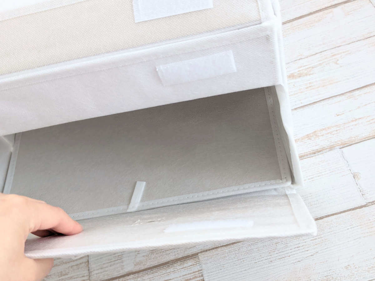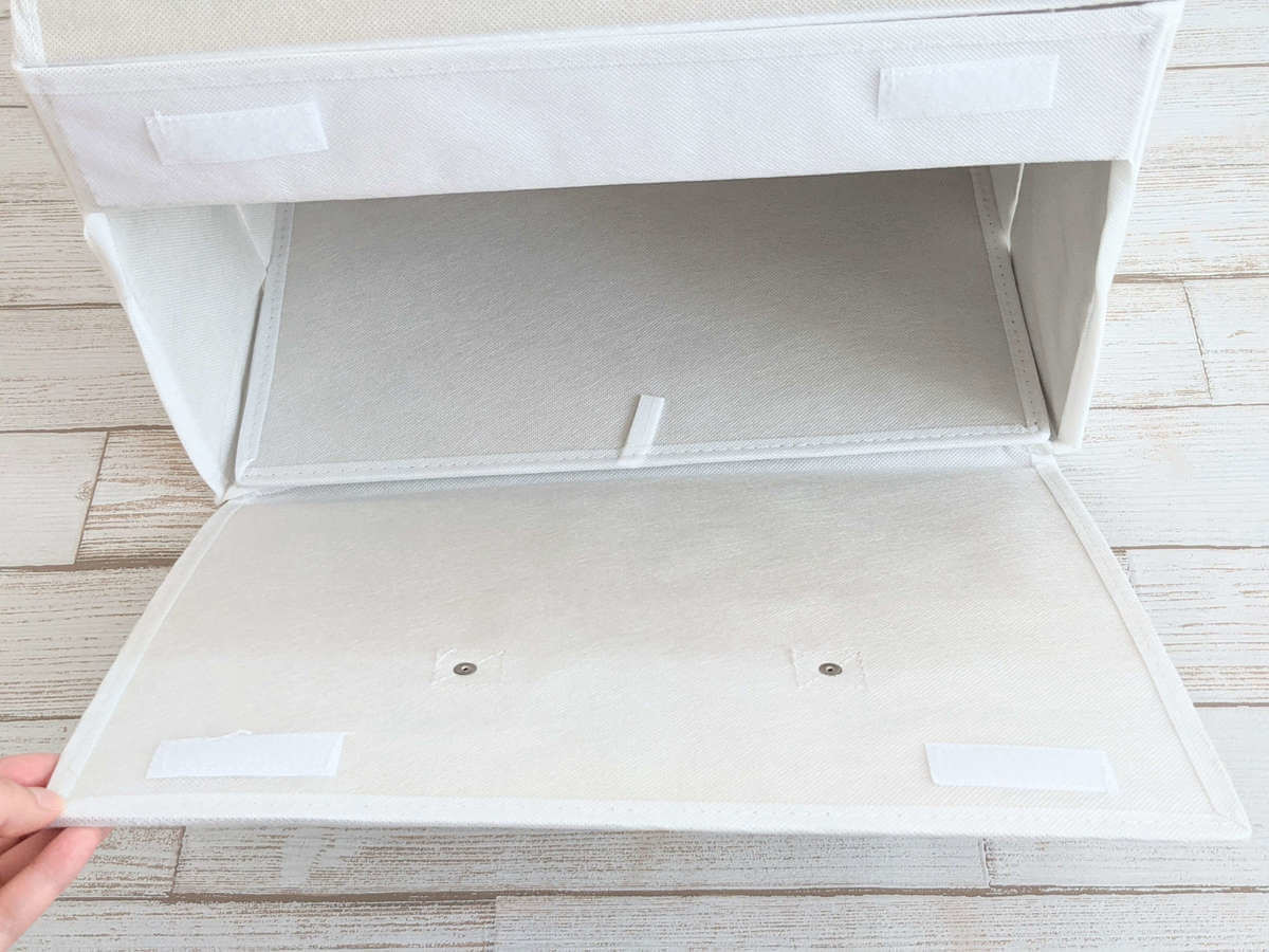 前から物を取り出す場合、まずフタのマジックテープをはがし、その後に前面を開けるので少し時間がかかります。 しかもマジックテープが強力なので、2度もはがさないといけないと思うとプチストレスに……。