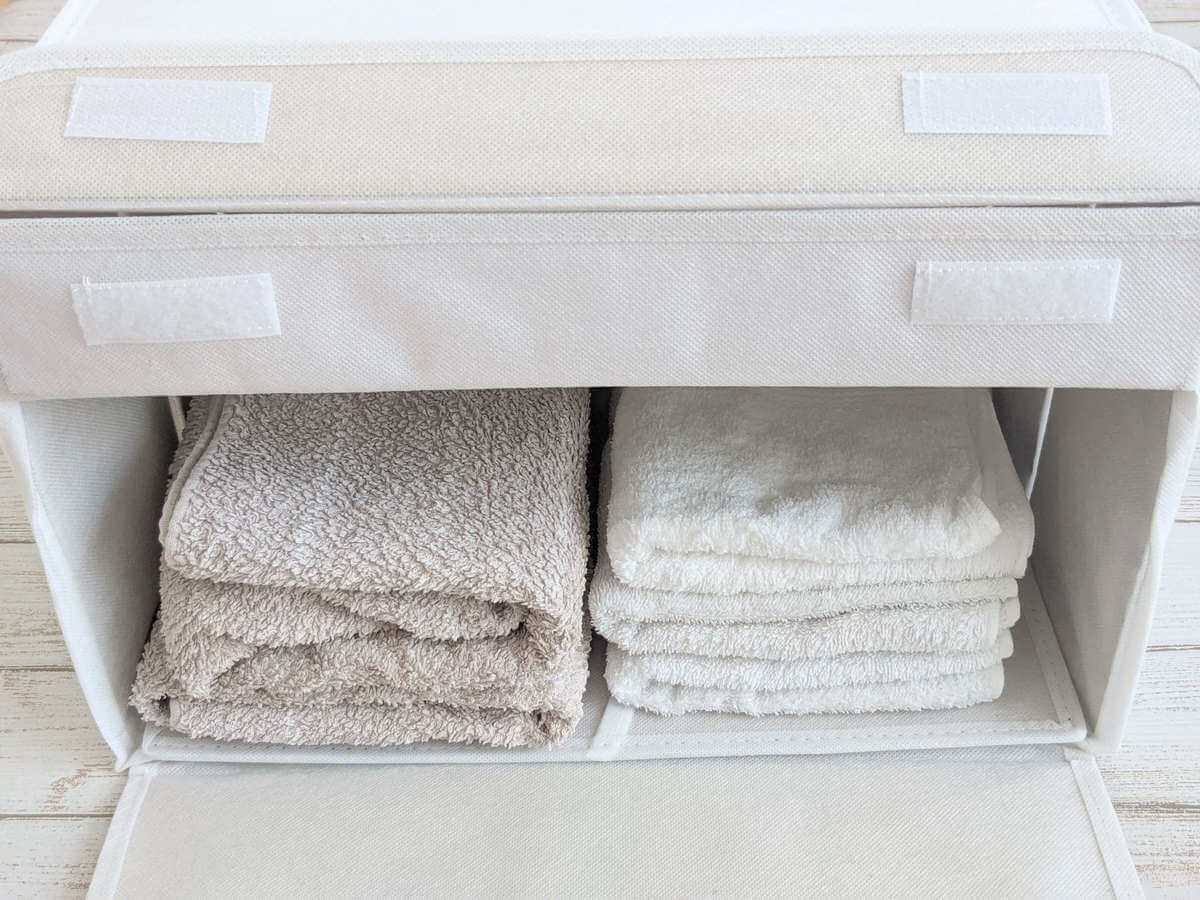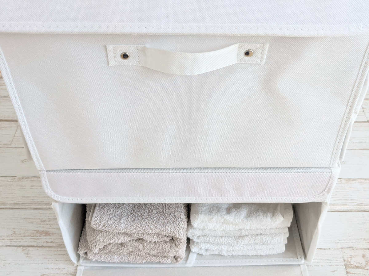こんな風にタオルを収納した場合、前面から出し入れができるので下の物が取り出しやすくて便利です。 何が入っているのか一目でわかるところも好ポイント!