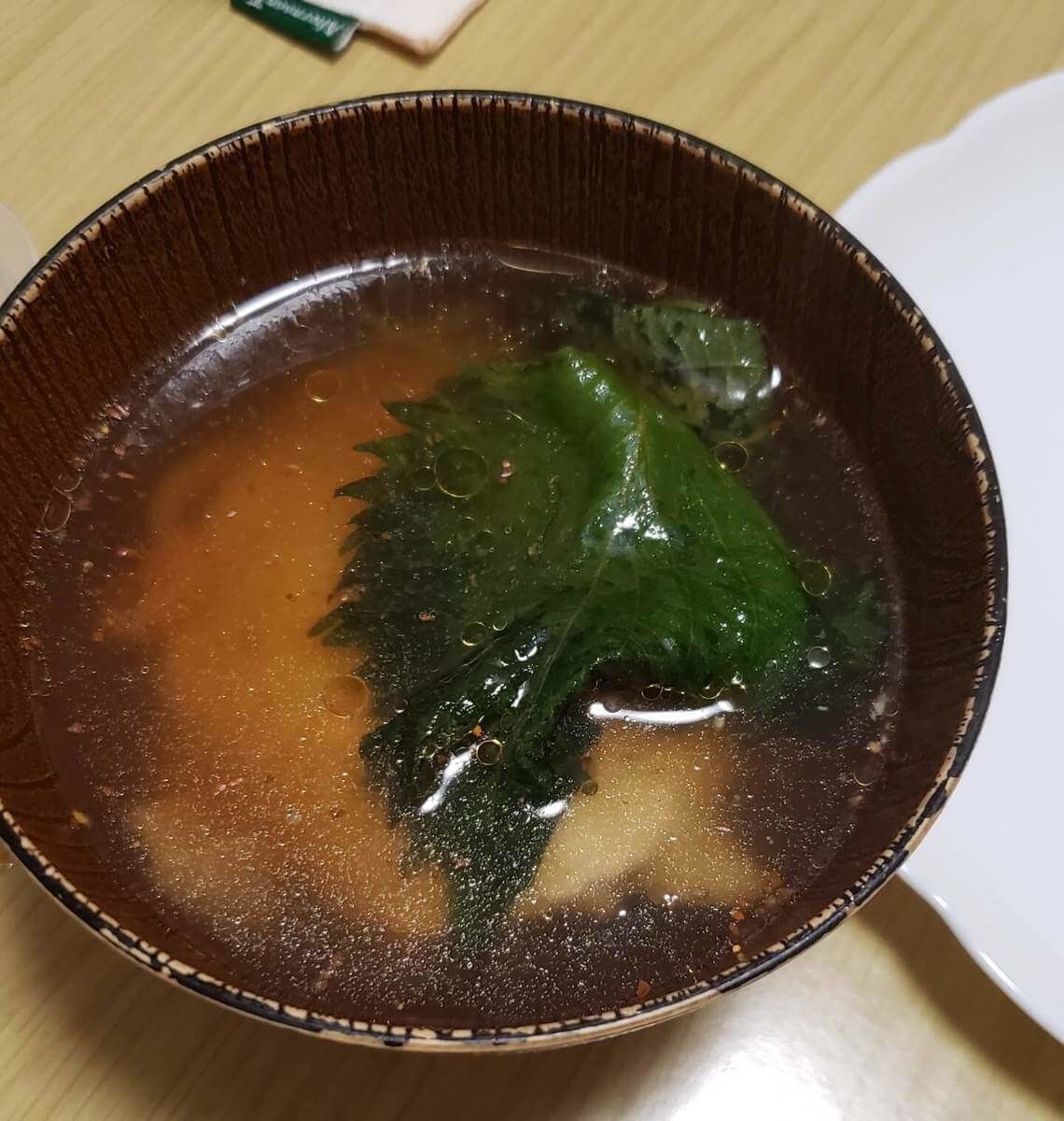 せんべい汁に入れれば味に変化を付けられます。大葉がごま油に浸かっているので、味噌汁にごま油を加えたのと同じ感覚で味変できます。