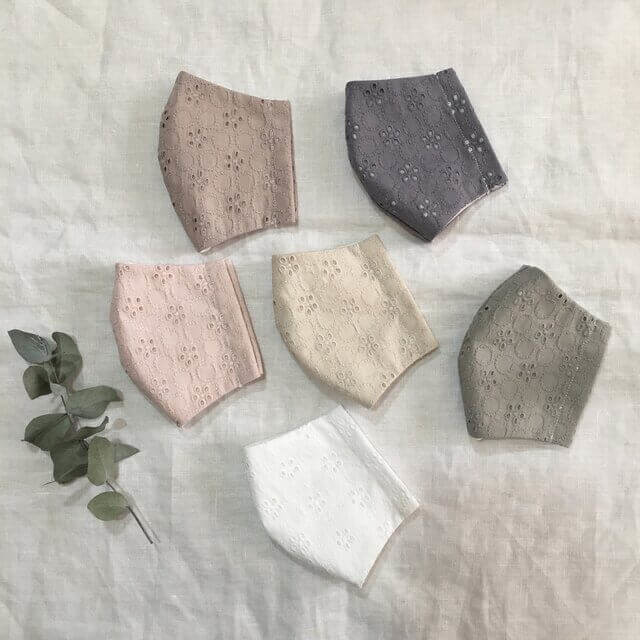ダブルガーゼ使用の立体マスクは、プチロンドン刺繍で大人可愛いデザインです。派手になりすぎないデザインは、オフィスでも使用できます。定番の白・黒、人気のくすみカラーの6色展開です。