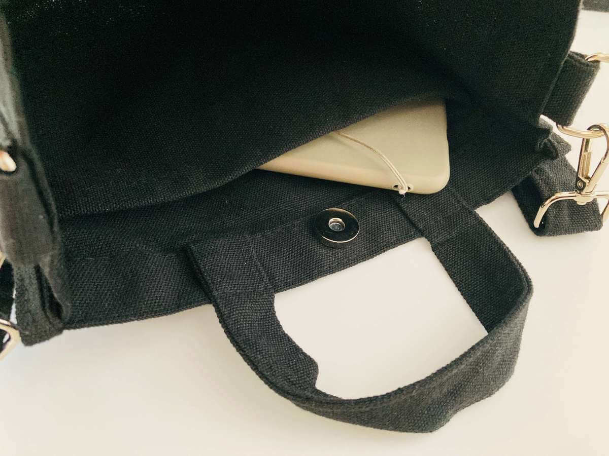バッグの口は開閉しやすいマグネットボタンになっています。中には深めの仕切りポケットも付いているので、スマートフォンや小物が混ざる心配もないですね。バッグの中で「どこ行った?」と探す手間が省けます。