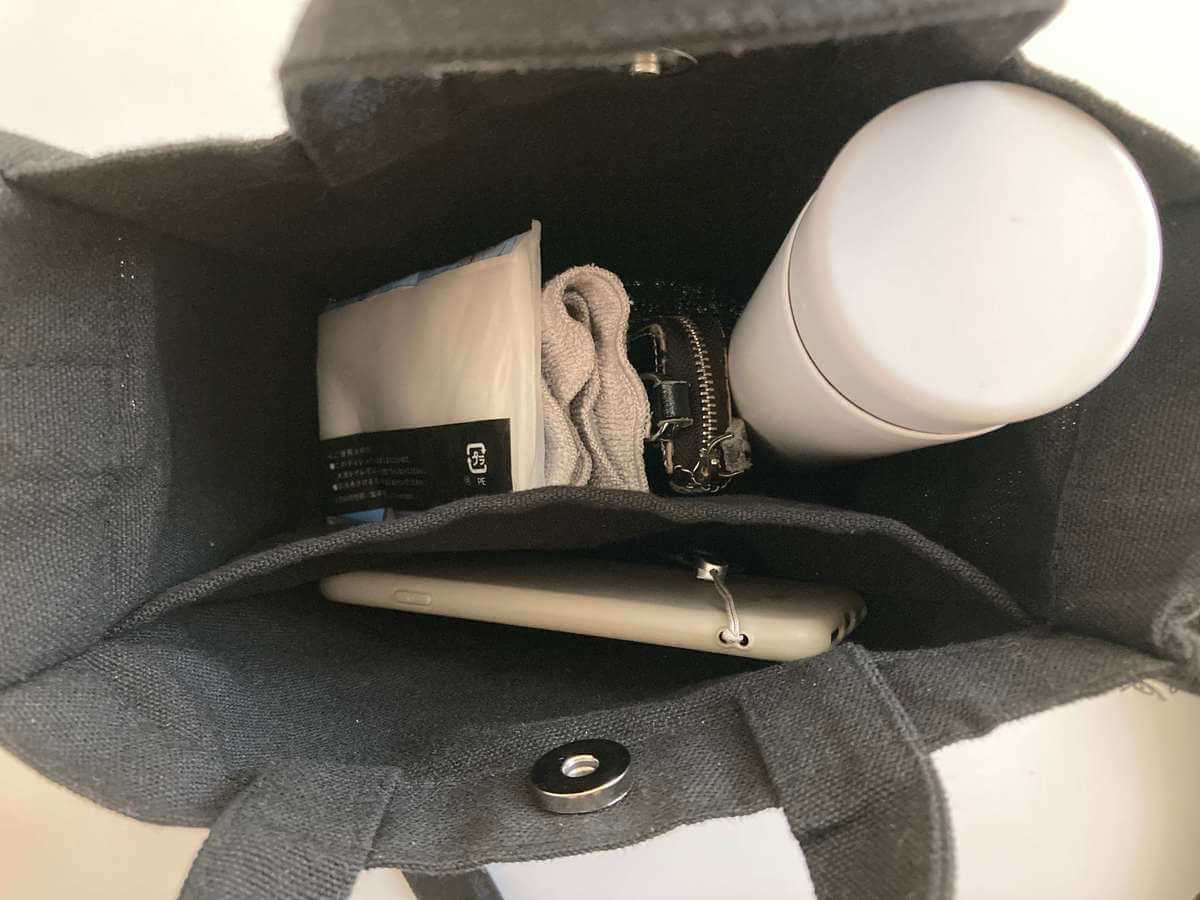 マチは実寸で約8.5cmあるので、見た目以上に大容量。500mlの水筒やハンドタオル・ポケットティッシュ・鍵を入れてみたらラクラク入りました♪