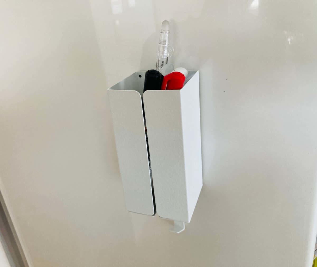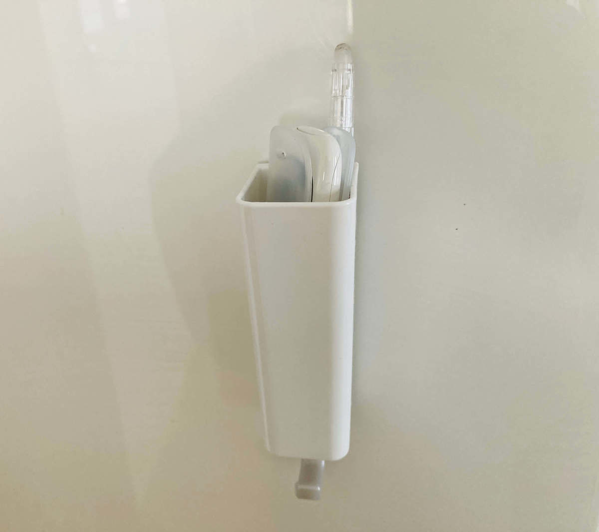 ダイソーの「冷蔵庫小物収納」なら、サイズも大きくてたっぷり入ります!体温計とボールペンの他にも、ホワイトボードマーカーが2本も入りました!収納力はバツグンです。