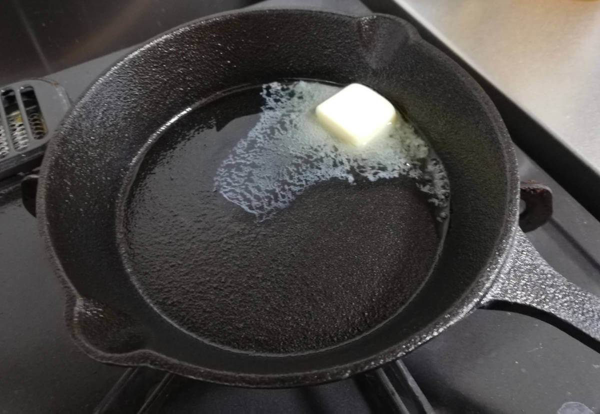 フライパン(今回はスキレットを使用)にバターを入れ、中火であたためる