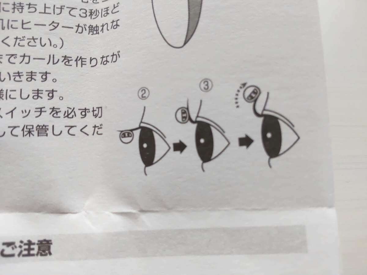 説明書のイラストを参考に、まつ毛に押し当ててコームをすべらせてクセを付けます。まつ毛をくいっと持ち上げるような感覚です。