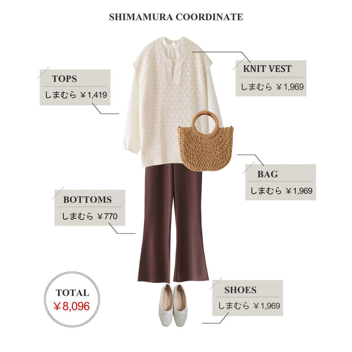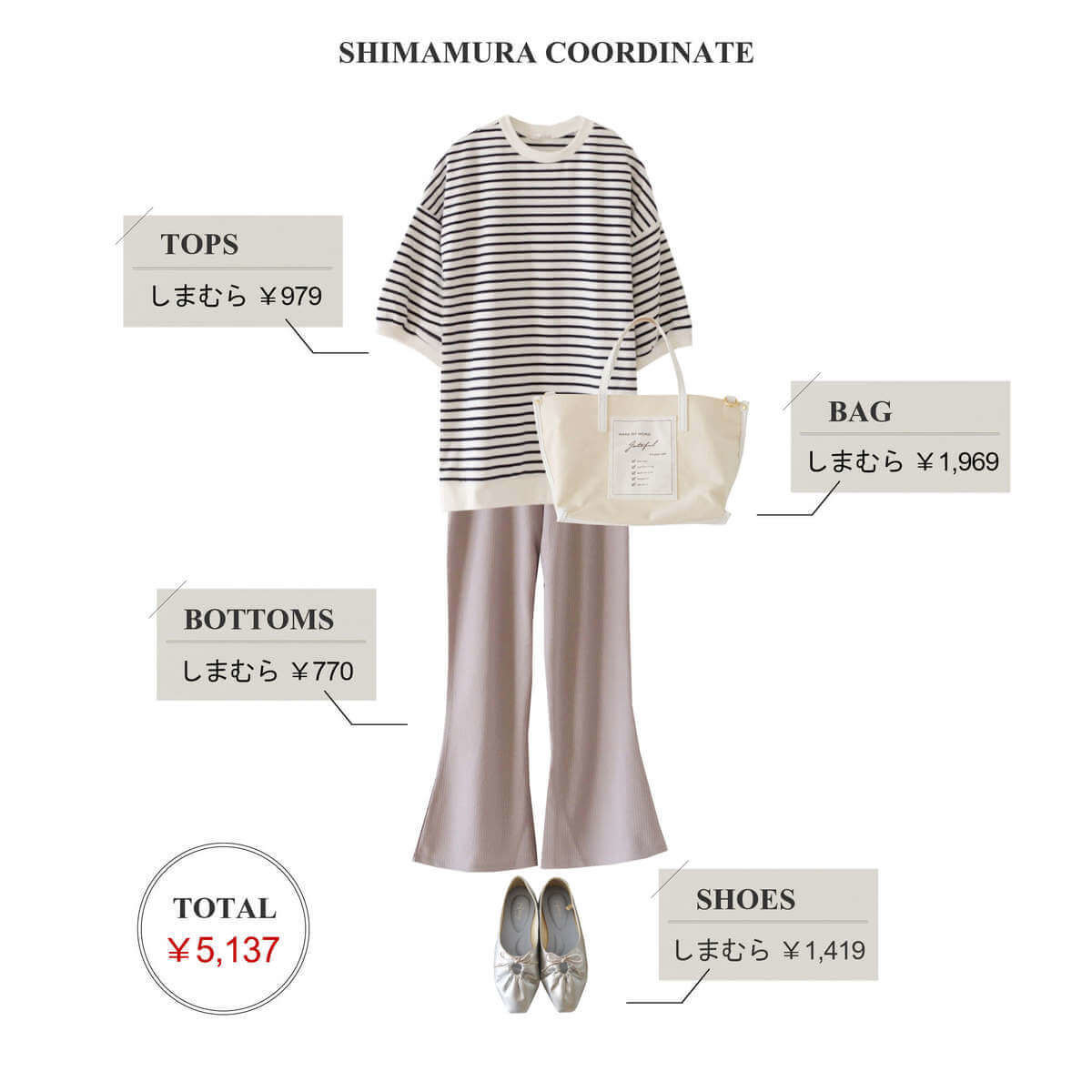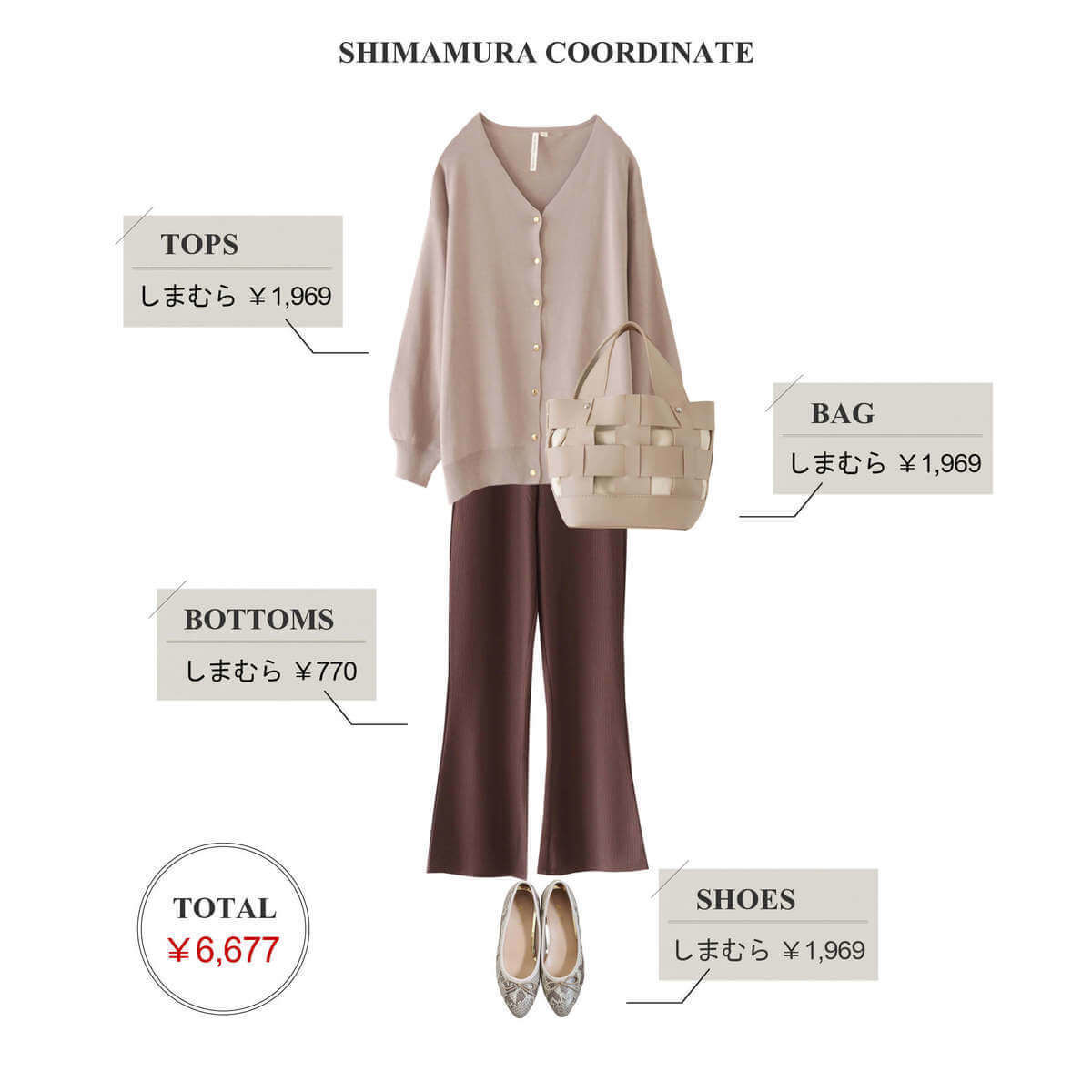 コーデに使用したアイテムは、すべて「しまむら」のものです。