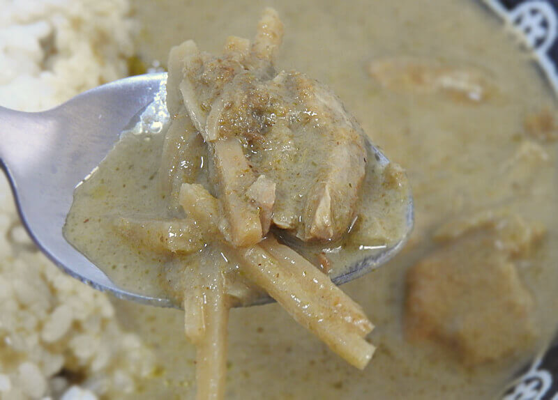 レッドカレーと同様に、マイルドな味わい。そして、えびの風味がプラスされていました。レトルトカレーで例えると、中辛くらい。今回食べたレトルトタイカレー3種類の中で、最もマイルドで食べやすい一品ですね。