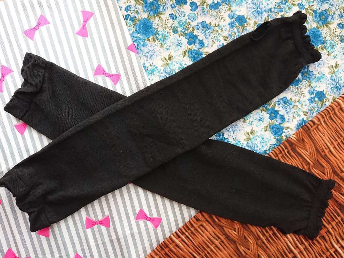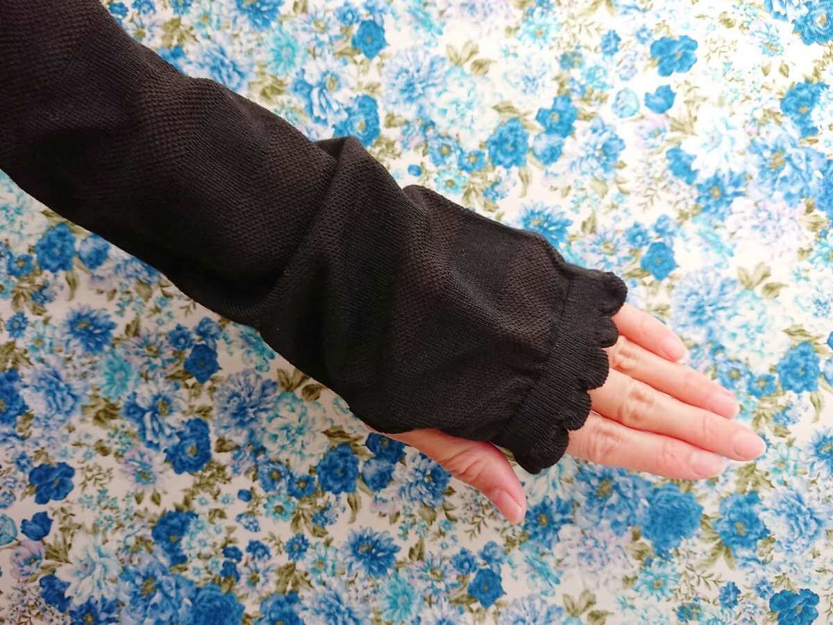 こちらは長さ48cmで肘上までしっかりカバーしてくれるタイプで、両サイドにゴムが入っているのでずり落ちて来なくて安心です。