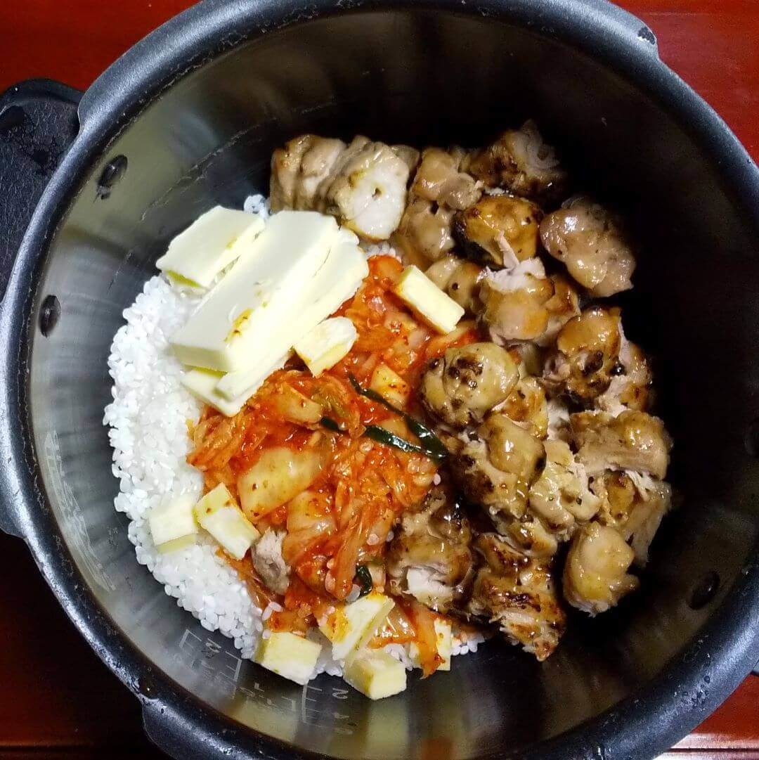 ①炊飯器にお米(2合)キムチ(2パック/100g)バター(3個/21g)2cmに切ったチーズ鱈(一袋/30g)を入れる