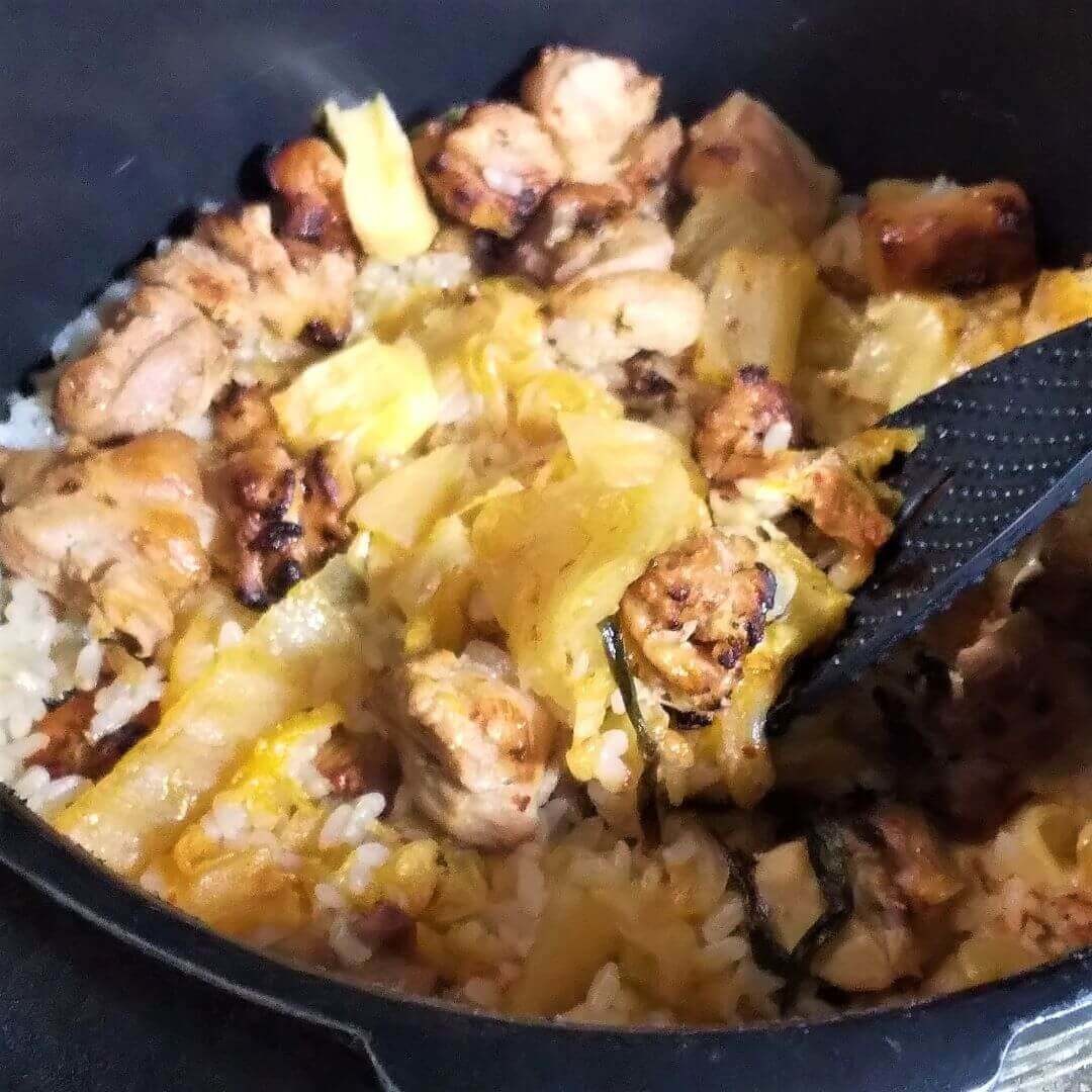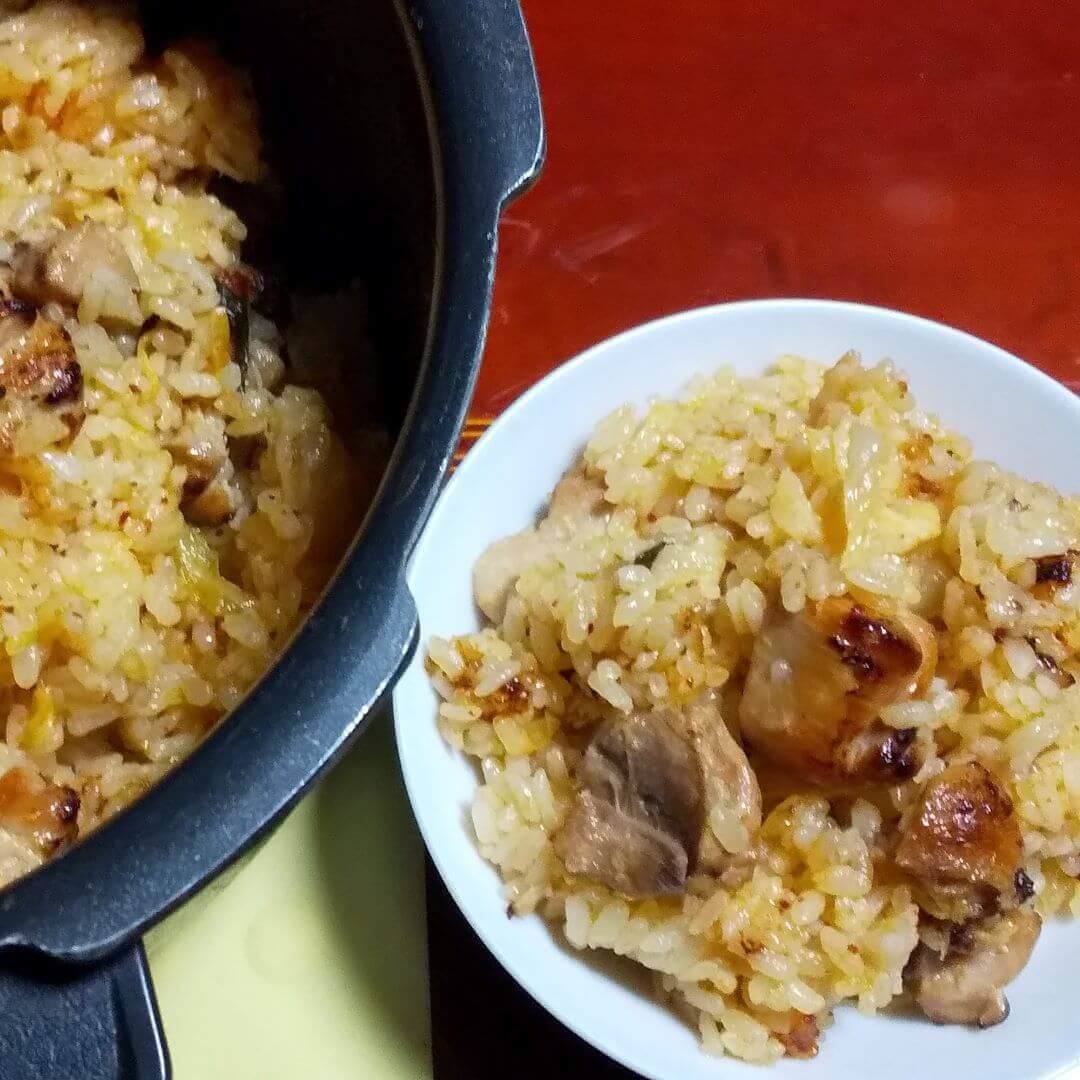 焼き鳥の肉汁のうま味とバターが染み込み濃厚な炊き込みご飯に