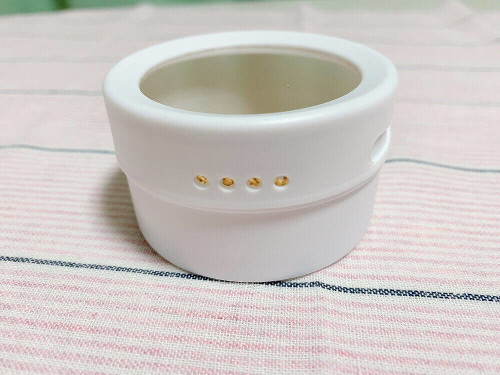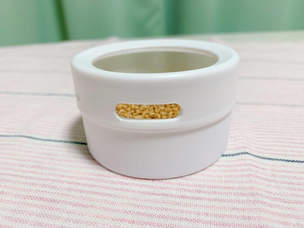 私は、使用頻度の高い「ゴマ」と「輪切り唐辛子」を入れてみました。店頭では気づかなかったのですがよく見ると、調味料を使うのにちょうどいい2種類の穴が開いています。