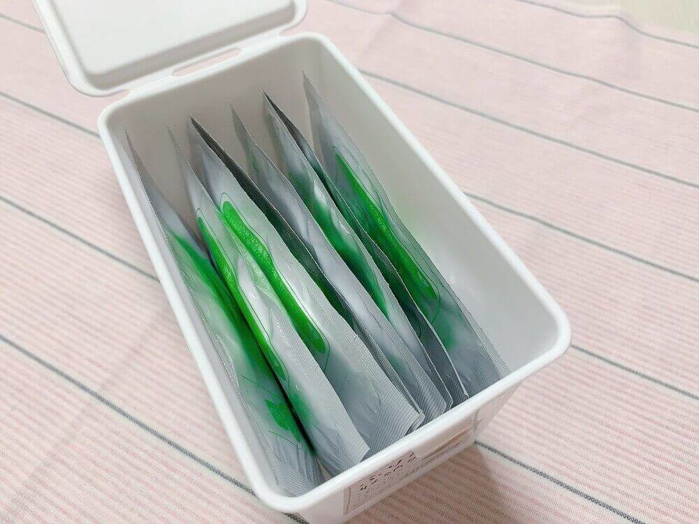 私は、わかめスープを入れてみました。これまでの収納法は、量が少なくなると倒れてしまうのが使いづらくてちょうど変えたいと思っていたところだったんです。