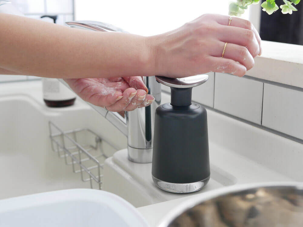 大きな「ポンプヘッド」で手首や腕でも押せる「ソープディスペンサー」。