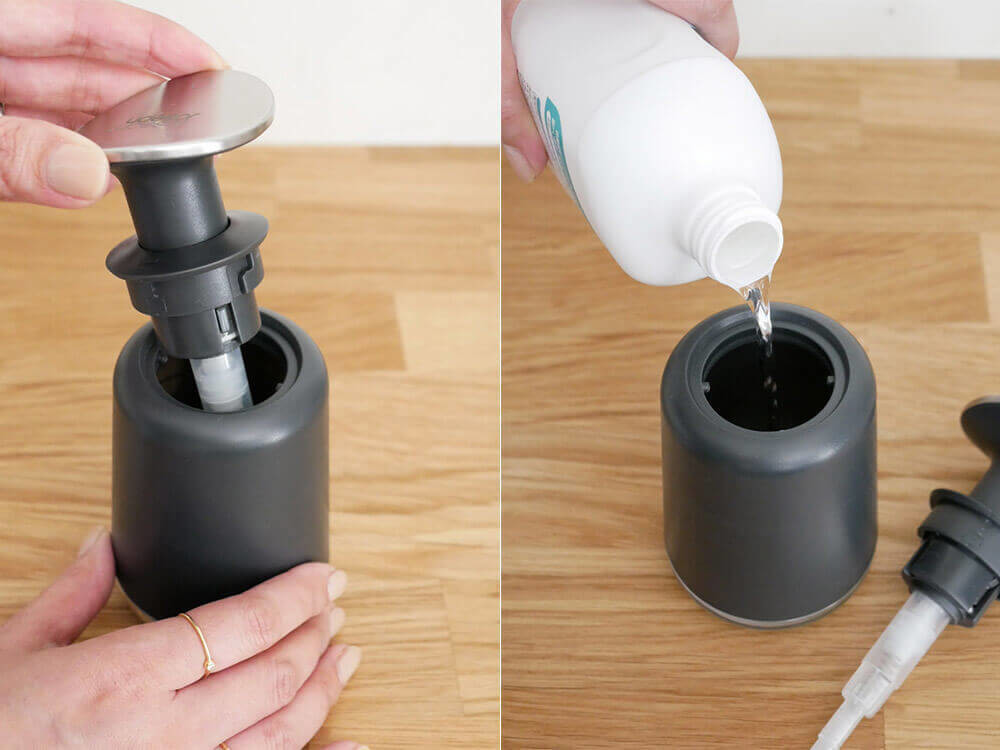 液体ソープ(最大容量250ml)を詰め替えの際は、上部のポンプ部分の凹凸のロックを少しだけ回して外します。 注ぎ口が広いので簡単に詰め替え作業ができるのは嬉しいですよね。