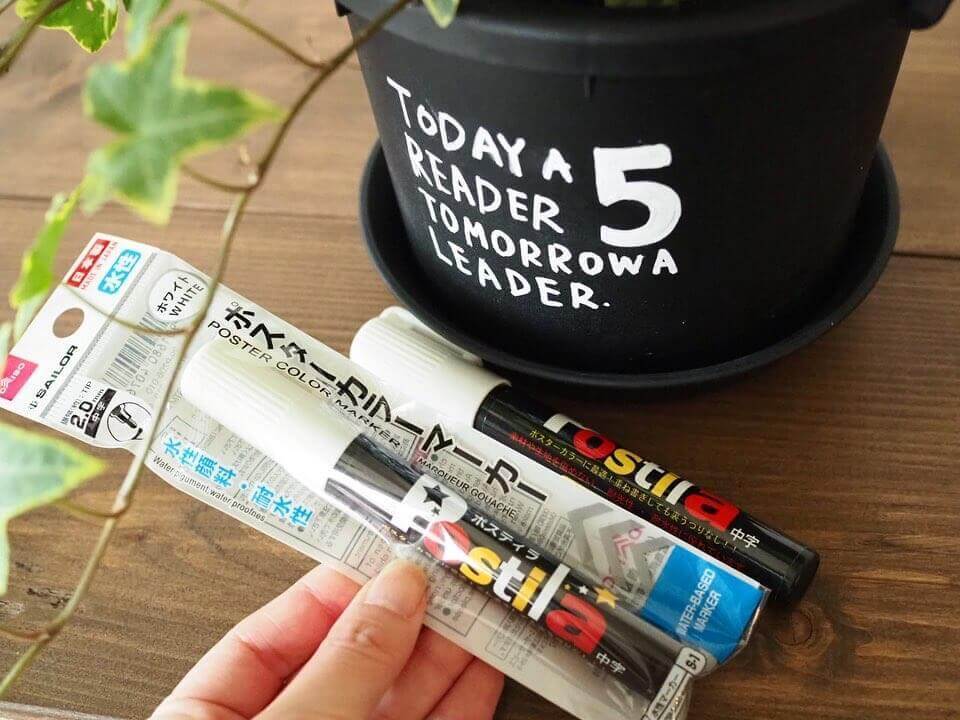 ダイソーで販売されている「ポスターカラーマーカー」のホワイトを使えば、とてもきれいな発色で黒い場所にも文字や絵を書くことができるんです♪