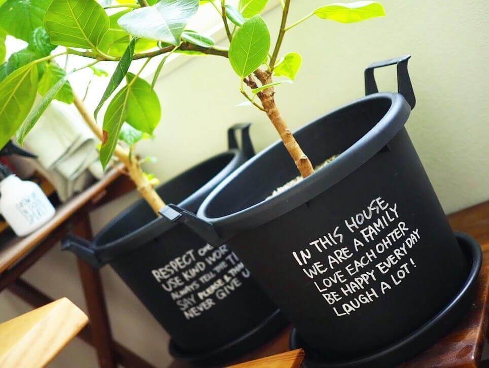 わが家では、マット調の黒い植木鉢に英字を書いてDIYアレンジを楽しんでいます。