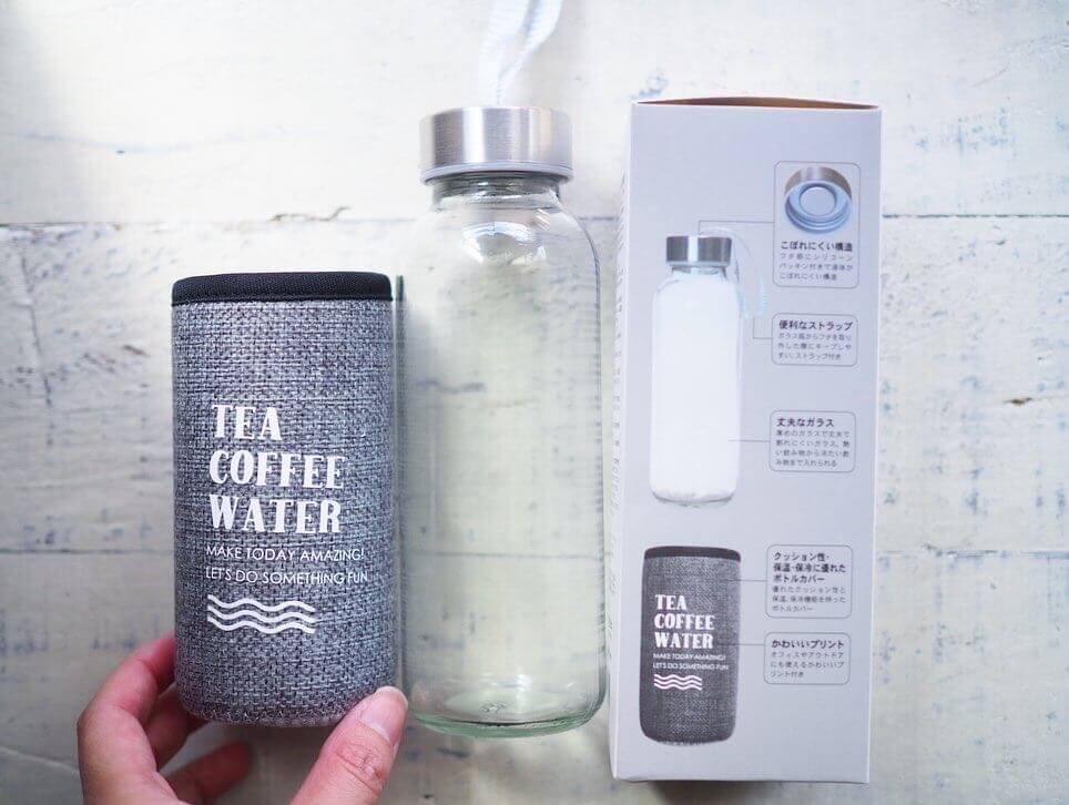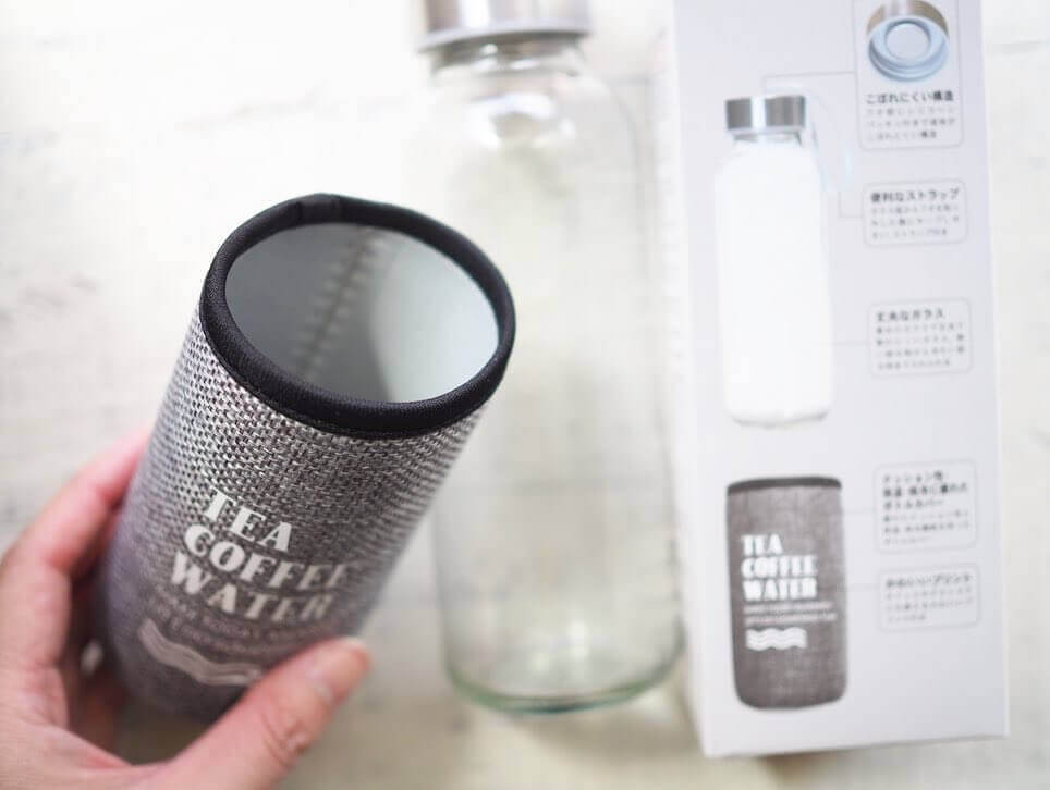 キャンドゥ新商品の「カバー付ガラスボトル」は、今までのドリンクボトルにはない「ガラス製」で温かいコーヒーなどを入れてもOKです。