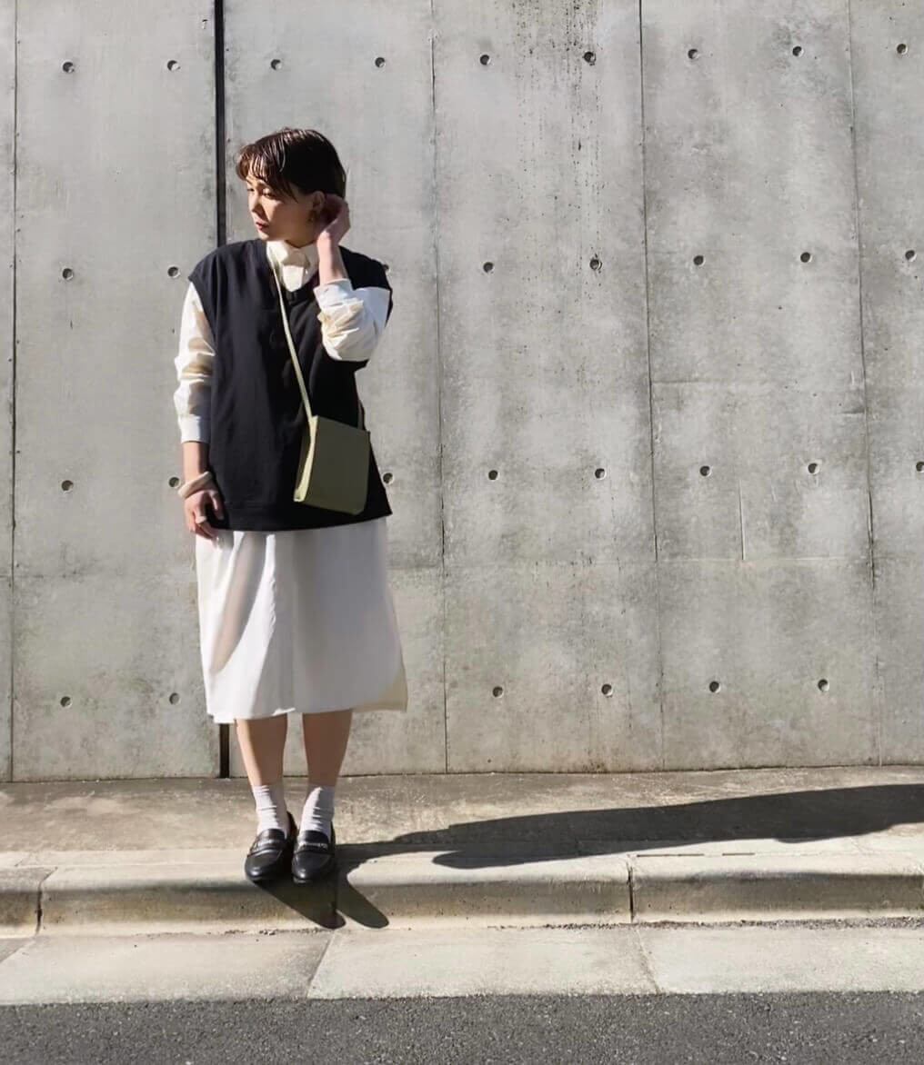 たまに夫婦でデートをする日は、ふだんのカジュアルスタイルを、女性らしく演出。フェミニンなワンピースに、カジュアルダウンできるベストを重ねると、今年らしい旬のレイヤードスタイルが完成します!