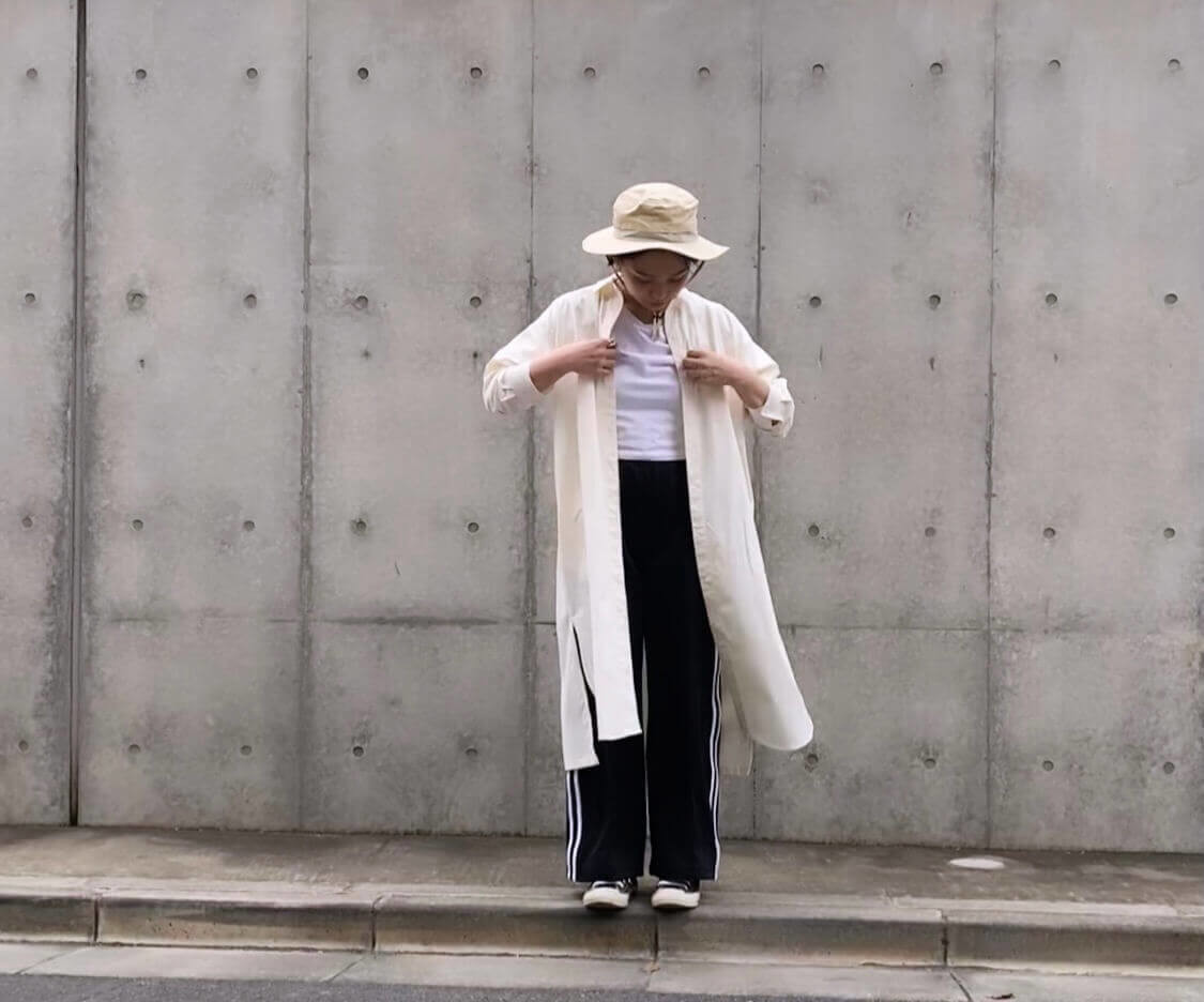 シャツワンピースの下は、シンプルな白Tシャツに、黒のラインパンツを合わせて、モノトーンにまとめるのも高見えのポイントです!