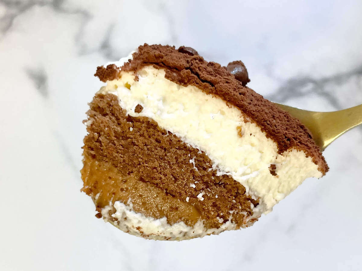 下から、ムースショコラ、クランチ、チョコレートスポンジ、アーモンドショコラ、ホワイトムースが順に重なっています。