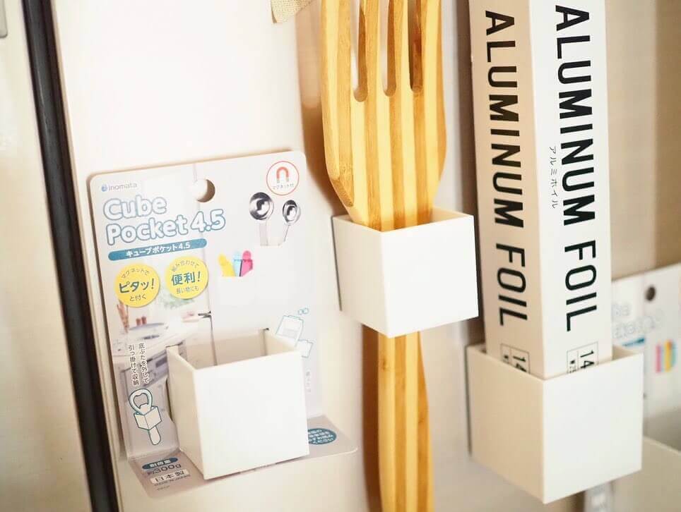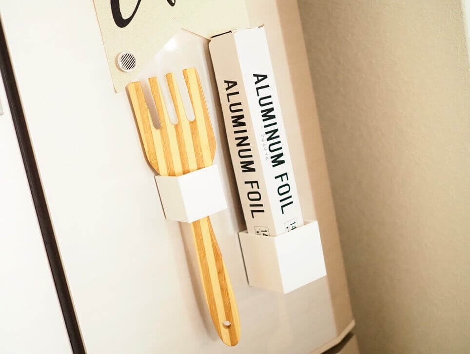 背中側にマグネットが付いているので、冷蔵庫など磁石がくっつく場所にワンタッチで取り付けられるのが便利!