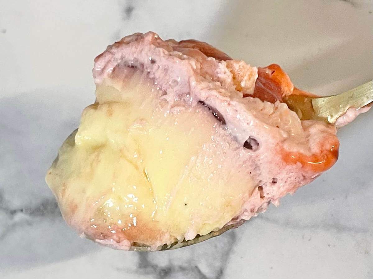 さらに下をすくうと、スポンジケーキやクリームブリュレの卵のコクが混ざって、また違った味わいに。