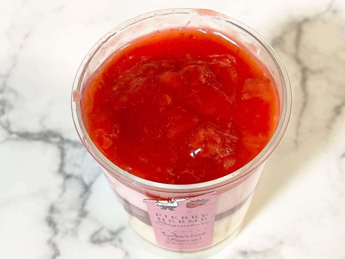 下から順になめらかなクレームブリュレ、しっとり食感のスポンジケーキ、ストロベリームース、ストロベリーソースの4層になっています。